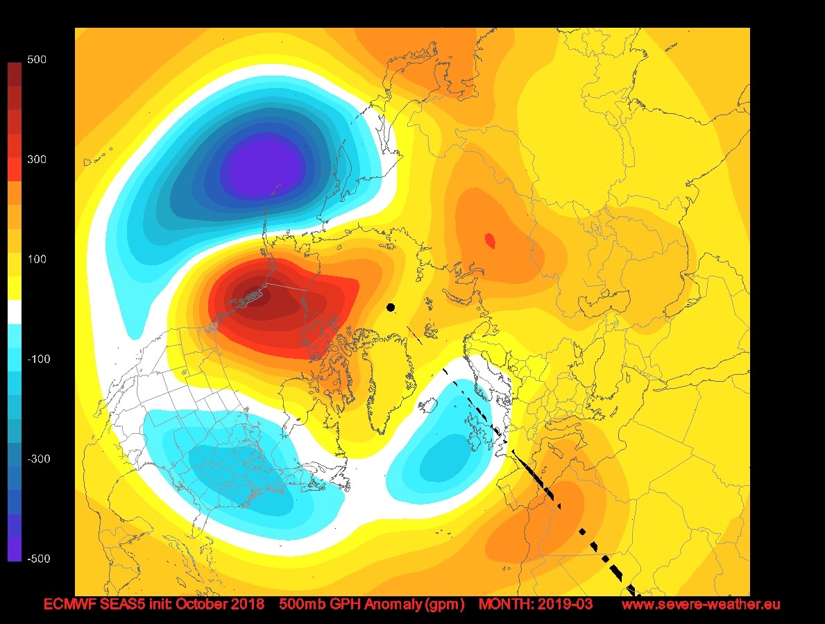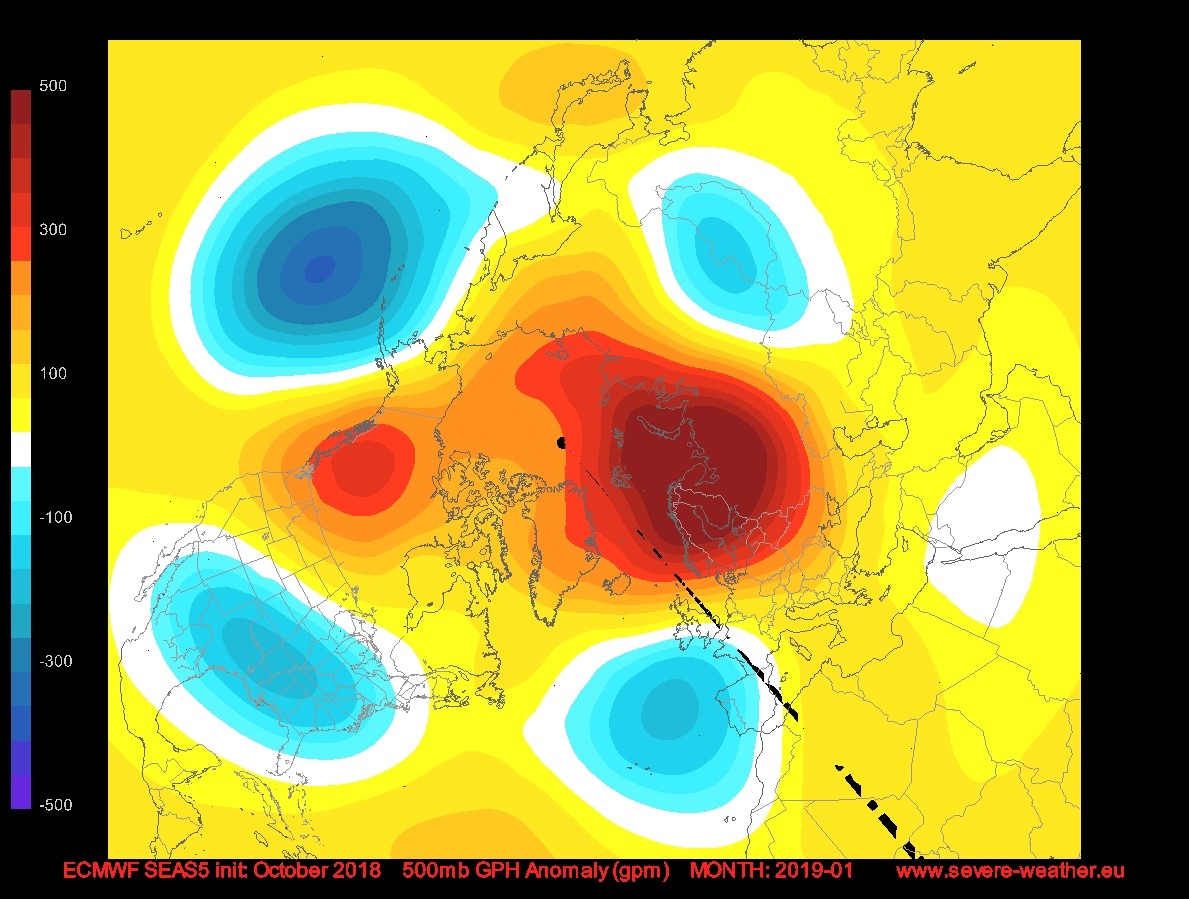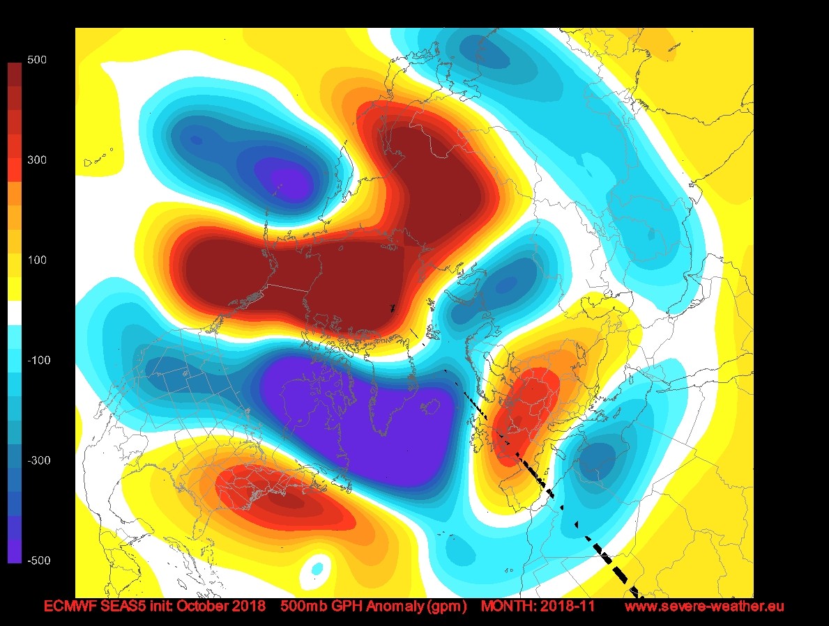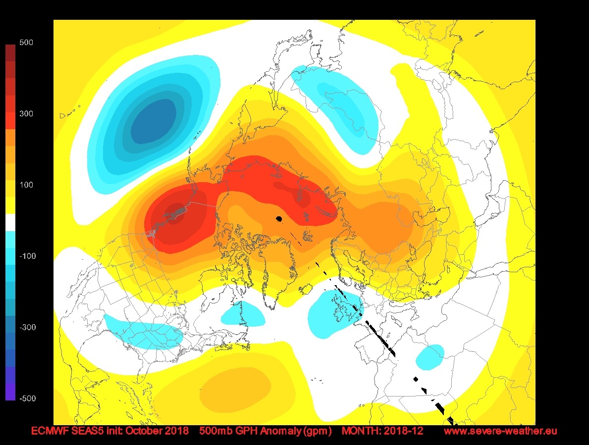ECMWF seasonal 500mb geopotential height anomaly forecast Charts show forecast departure of 500mb geopotential height, from the model climatology. Negative anomalies indicate troughs and low pressure systems, and positive anomalies indicate ridges and anticyclones.