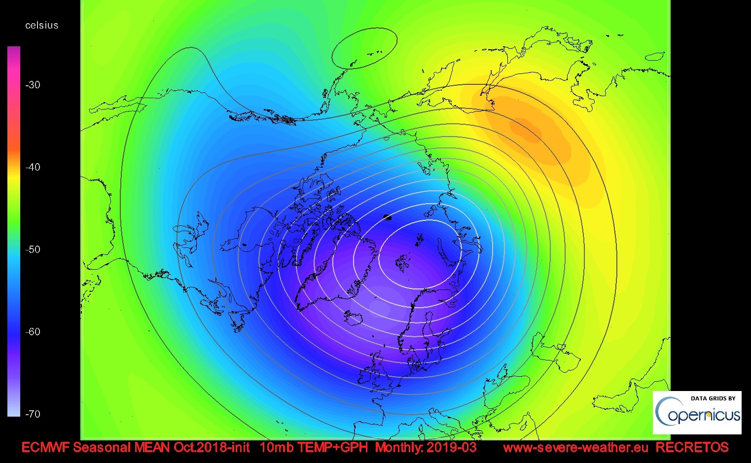 Charts show the geopotential height and temperature ensemble mean forecast on the 10mb level, which is at around 28-32 km altitude. This is of importance when forecasting stratospheric polar vortex dynamics which can have major impact on winter weather around the north hemisphere.