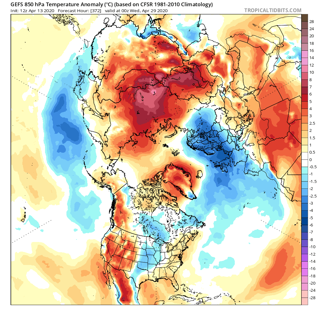 We can see the relocation of the polar vortex, as a low-pressure area, extending from the Siberian regions into Scandinavia and into parts of central and eastern Europe. This is essentially the main core of the tropospheric polar vortex, connected up into the mid-stratosphere. This low-pressure area actually promotes southerly flow on its eastern side, further boosting the transport of the abnormally warm air into the Siberian region and the polar circle. On its western side, colder air is being transported from the north, down into Scandinavia and parts of central/eastern Europe, and extending west into the British isles, on the reverse zonal flow. A situation like this in mid-winter would bring proper cold and snow to Europe. This is essentially what the expected result would be from a Sudden Stratospheric Warming event in winter (“the beast from the east” in the United Kingdom). The strong blocking ridge continues to bring warmer than normal airmass into Greenland and the Arctic. Over North America, the bulk of the cold air remains in the Canadian sector.