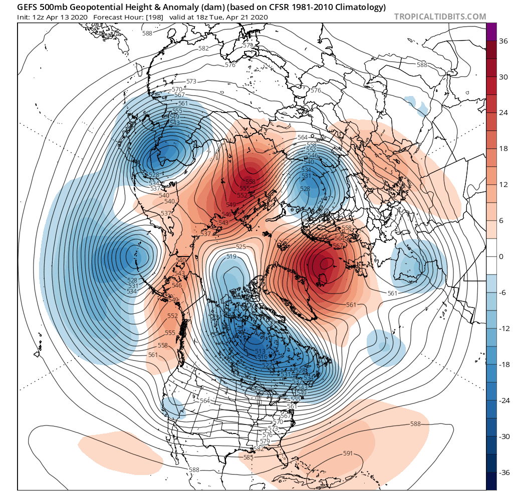 The period we are currently focusing on is week 4 of April. As we wrote in our previous outlook article, the main point of uncertainty was the development of the blocking high ridge in the North Atlantic. Models have become more clear now, and reveal a very strong high-pressure system forming in the next 6-9 days. Its formation is powered by the strong low-pressure system over the Canadian sector. Below is the GEFS ensemble model forecast, showing the strong blocking ridge in the North Atlantic.