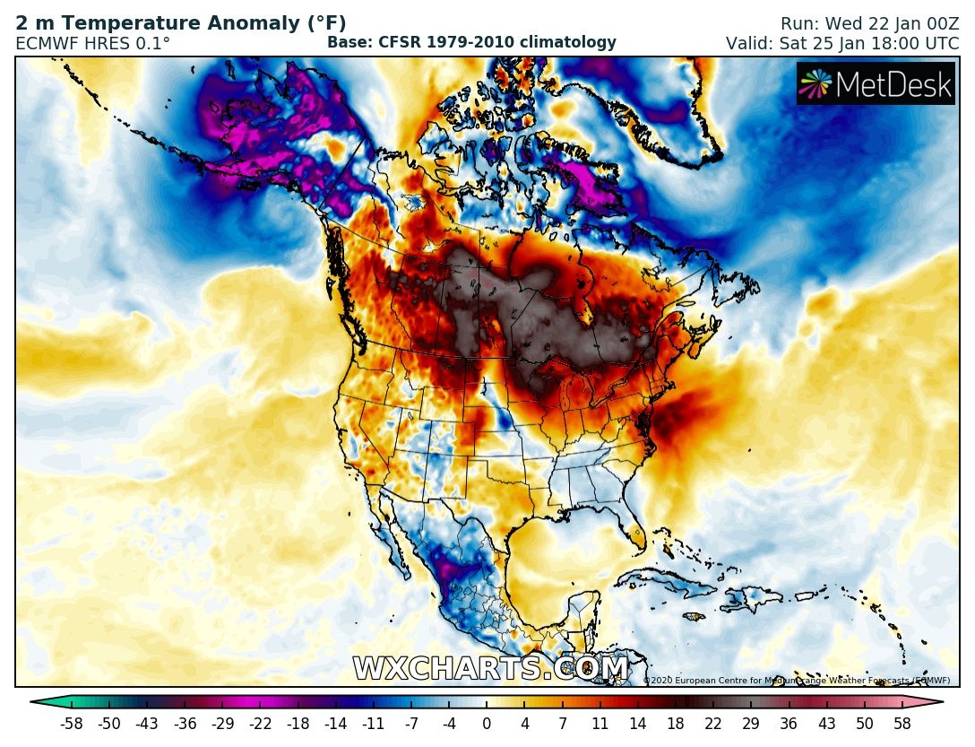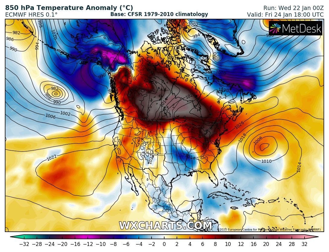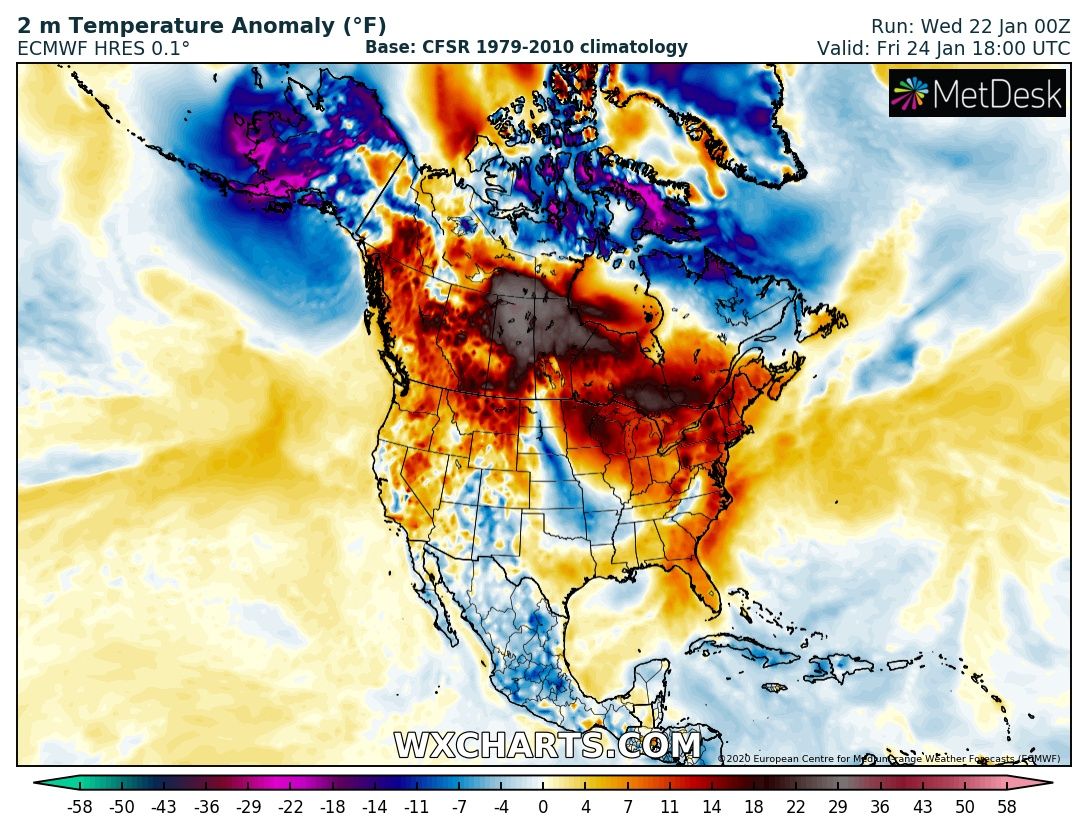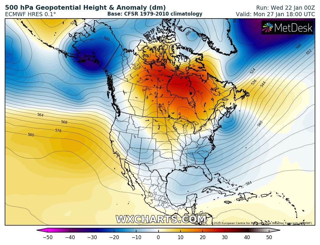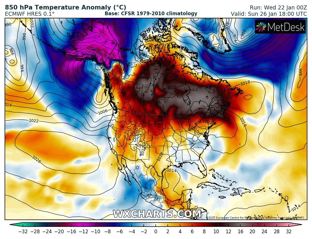 Mid-range trends are likely to bring very warm weather across much of Canada as a powerful upper-level ridge develops this weekend and maintain its strength throughout the rest of January. It appears likely mid-levels will significantly warm, resulting in a strong thermal inversion beneath. Still, models are hinting both mid-levels and surface temperatures will be very warm for the end of January, likey 10-15 °C above long-term average! But meanwhile, the intense upper core will push extremely cold Arctic air mass across Alaska and Yukon states again.