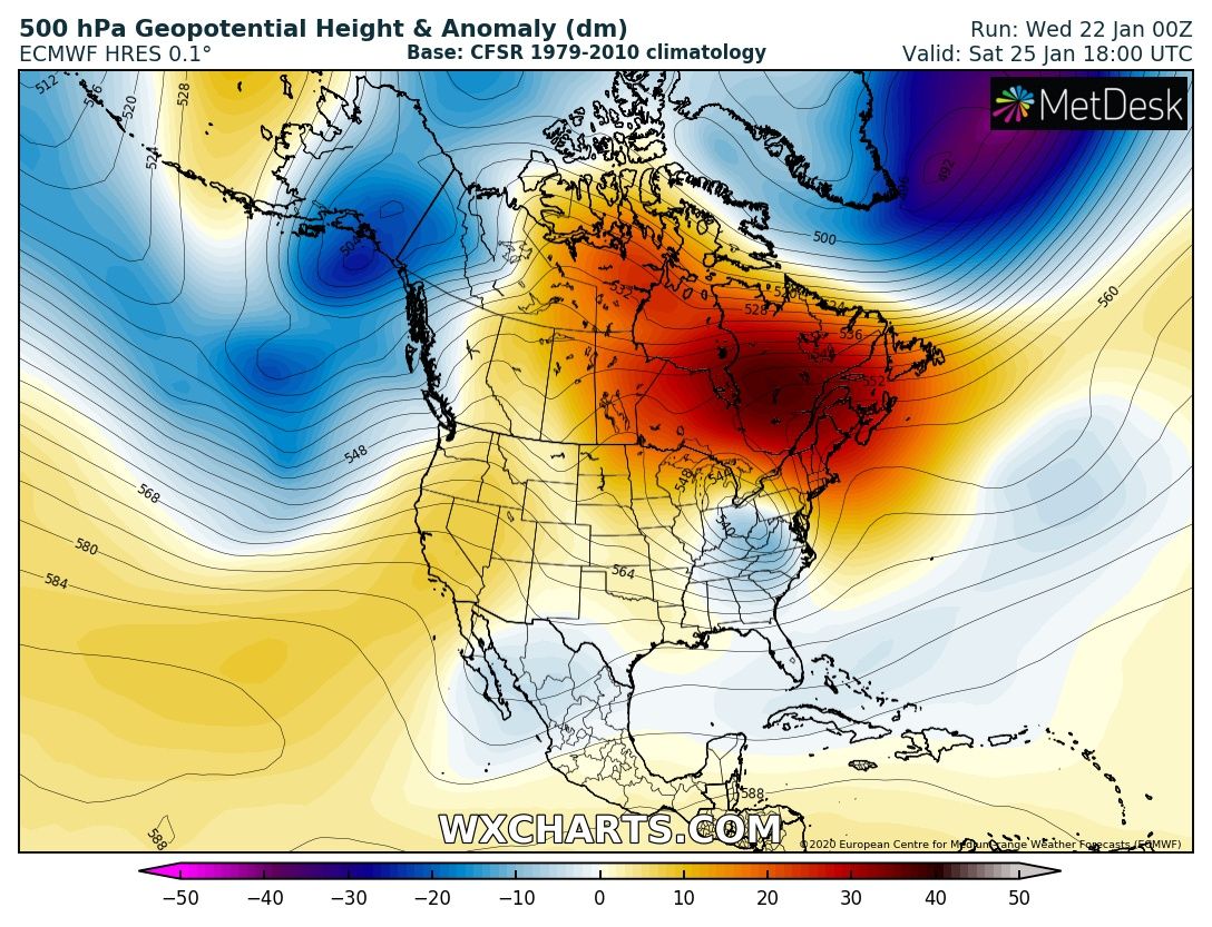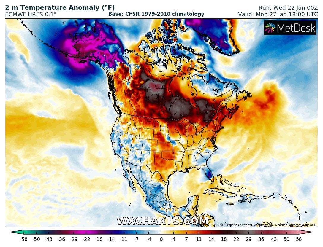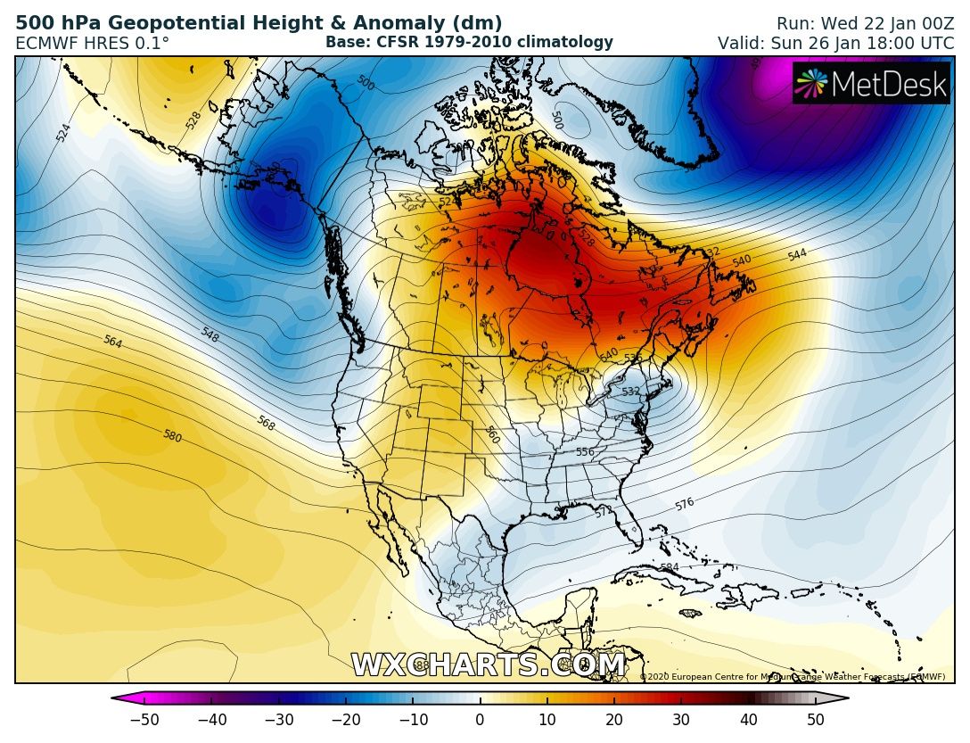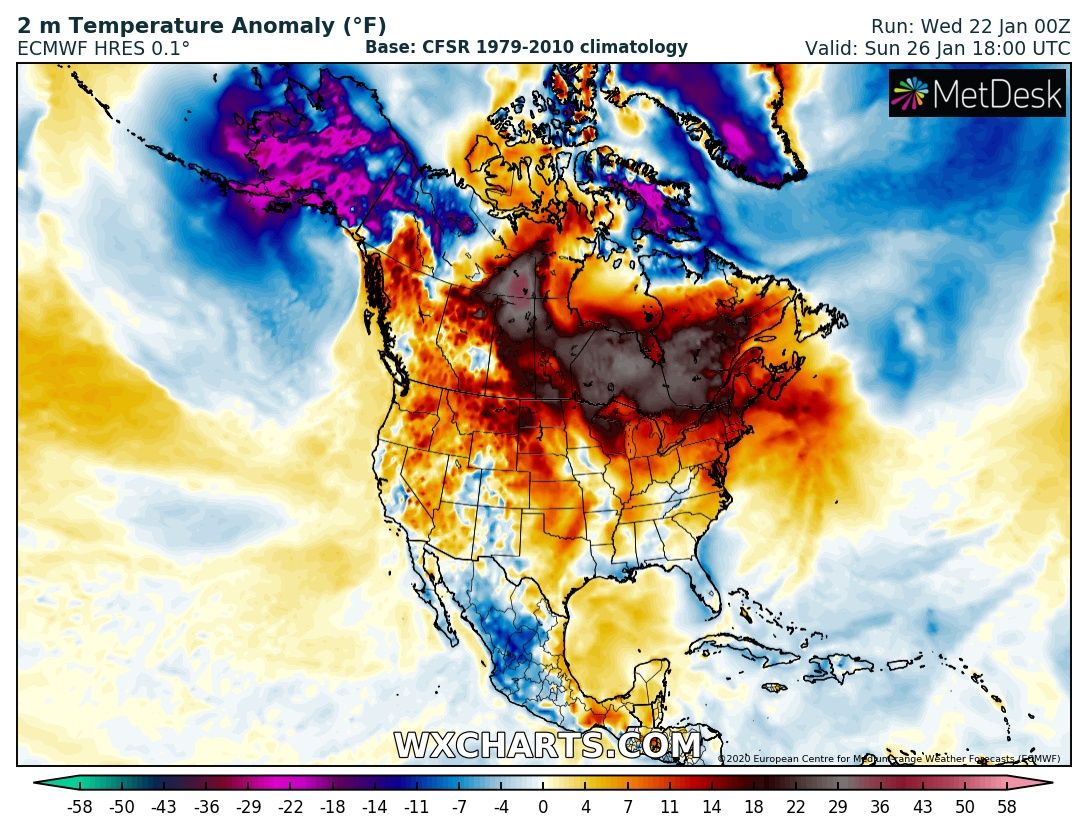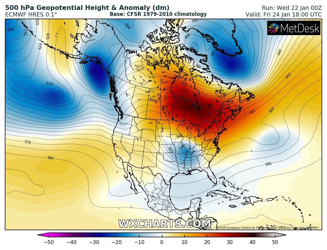 Mid-range trends are likely to bring very warm weather across much of Canada as a powerful upper-level ridge develops this weekend and maintain its strength throughout the rest of January. It appears likely mid-levels will significantly warm, resulting in a strong thermal inversion beneath. Still, models are hinting both mid-levels and surface temperatures will be very warm for the end of January, likey 10-15 °C above long-term average! But meanwhile, the intense upper core will push extremely cold Arctic air mass across Alaska and Yukon states again.