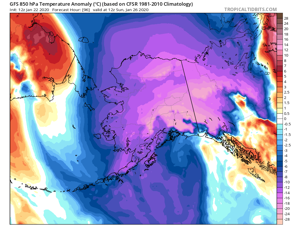 As said above, an intense cold blast develops along the western flank of the extensive Canadian upper-level ridge, develop a brutal cold period for Alaska through early next week. 850 mbar temperature and near surface temperatures will be 25-30 °C lower than normal, despite parts of Alaska are in a deep freeze. This should bring -40 to 50 °C / -45F temperatures in a broader area.