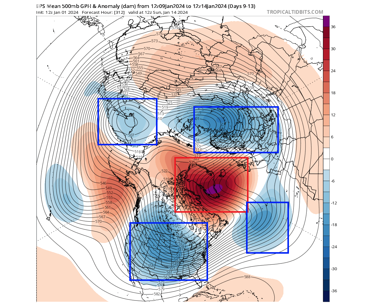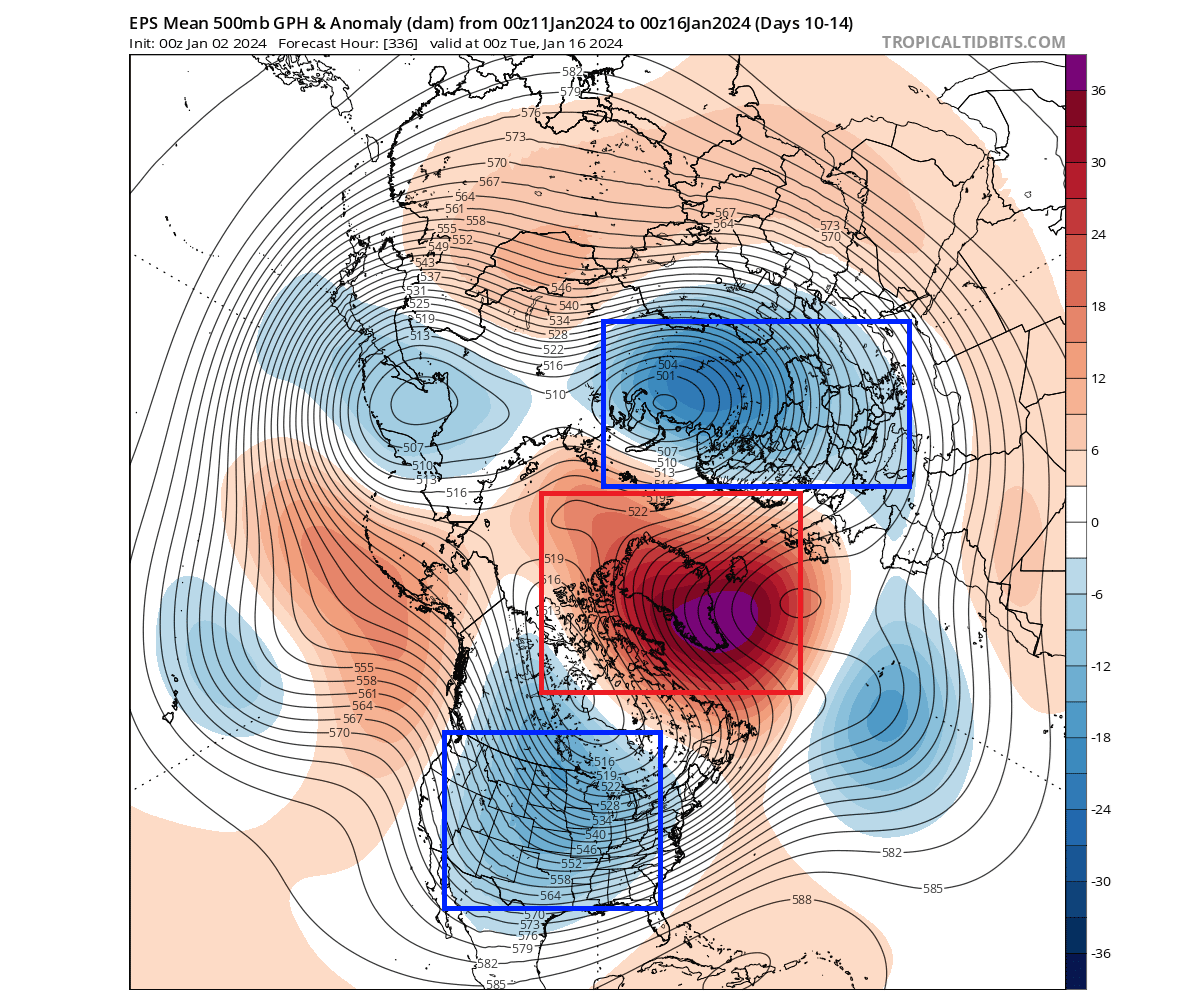 Below is an old forecast by ECMWF, issued in mid-December. It shows the pressure anomaly for the second week of January 2024, almost a month ahead. At that time, when warm anomalies were spreading across the United States, it seemed more like fiction than reality.