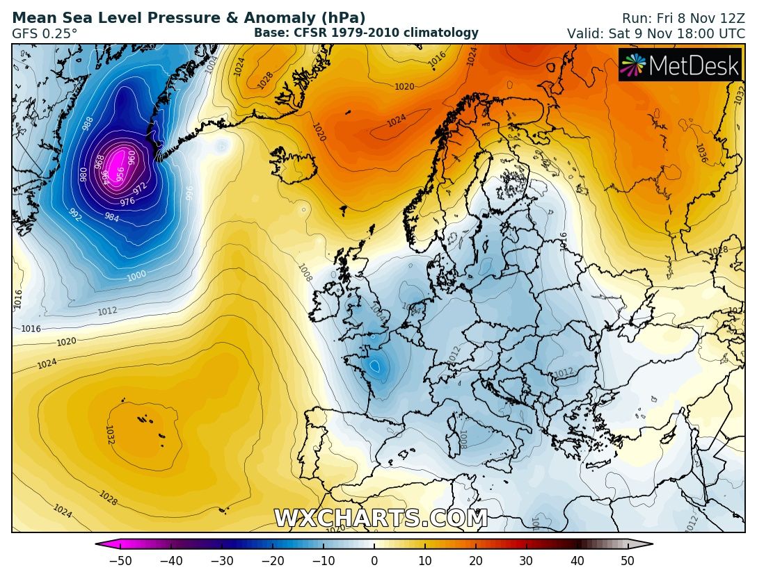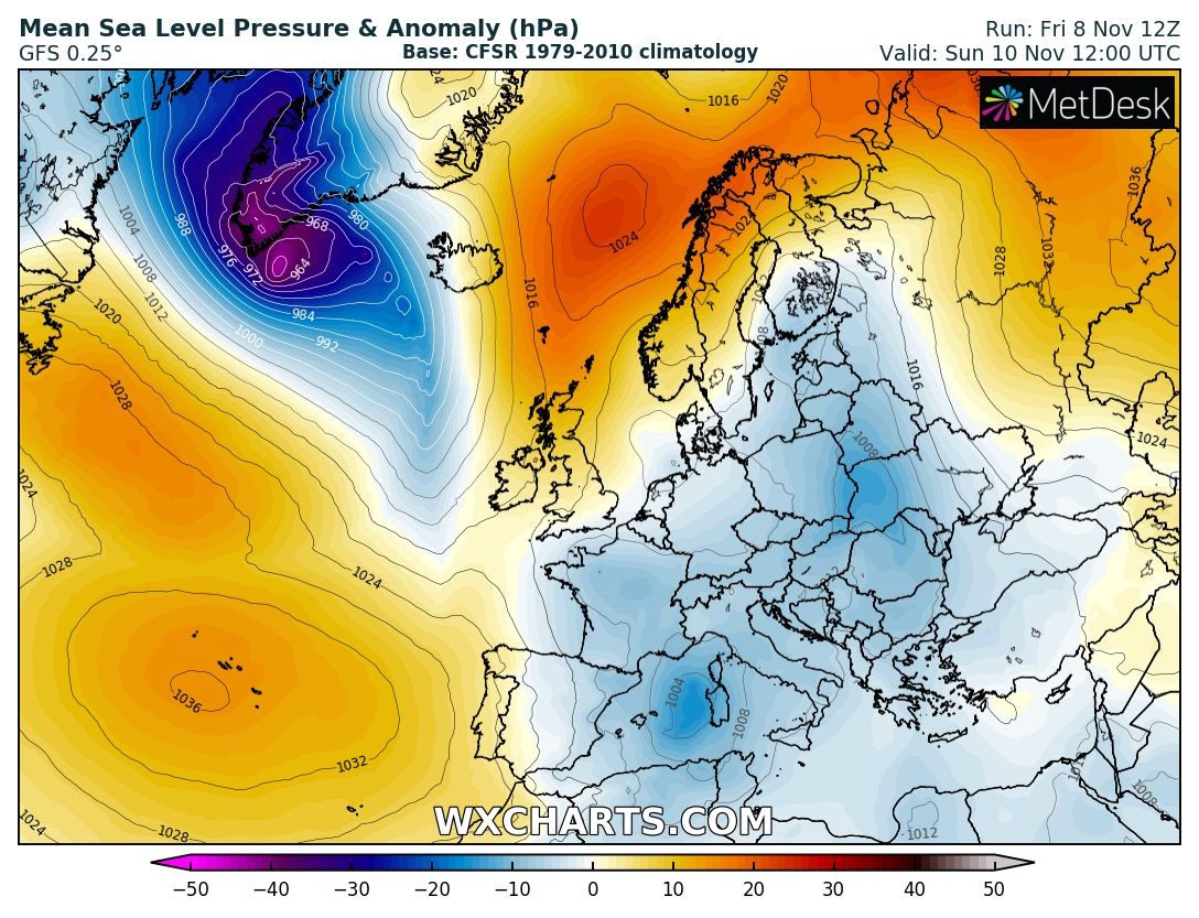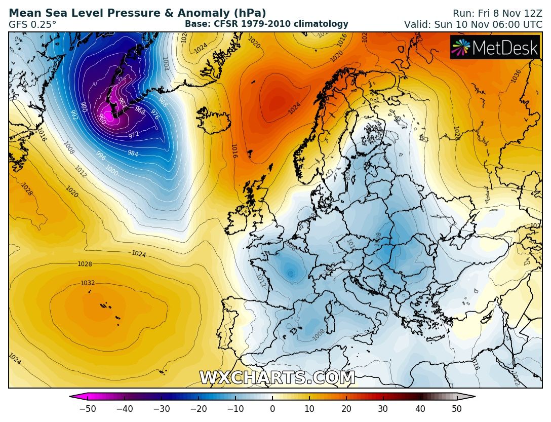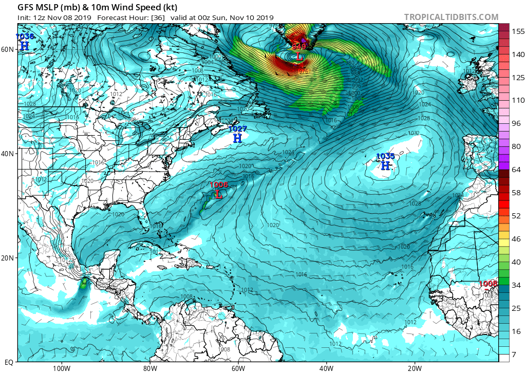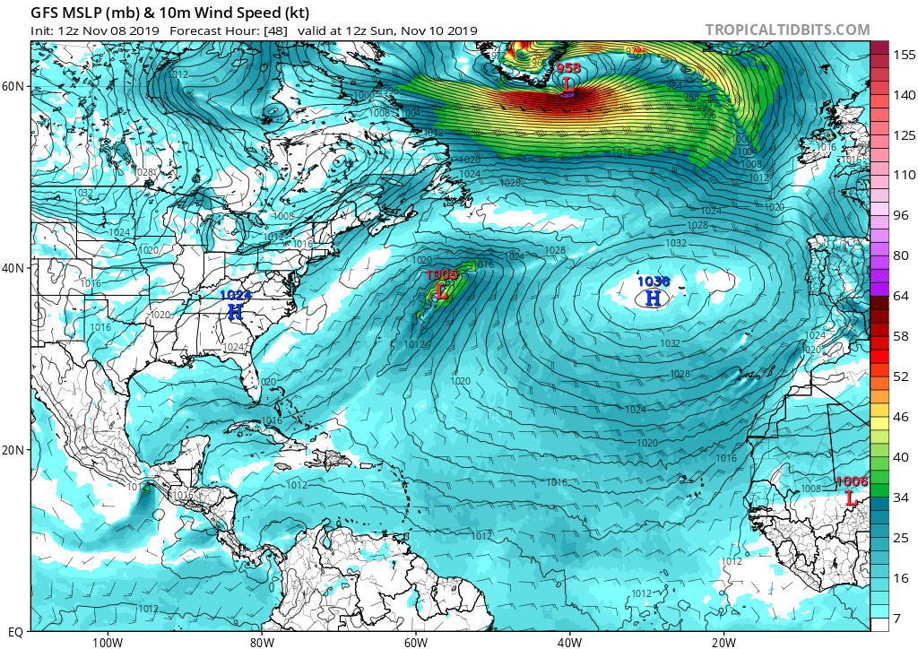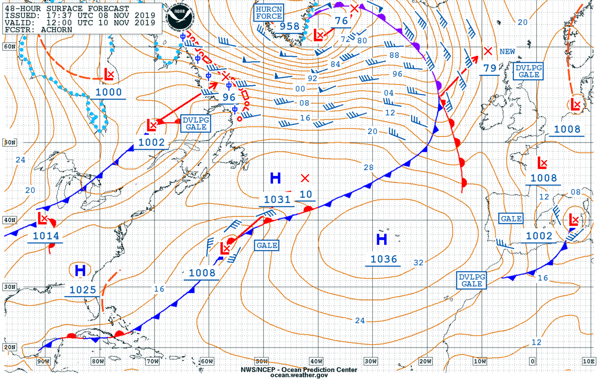 NOAA OPC forecast for the North Atlantic on Sunday, Nov 10th 12 UTC – a very intense windstorm with hurricane-force winds is expected. The center of the low will be just to the east of the southern tip of Greenland.