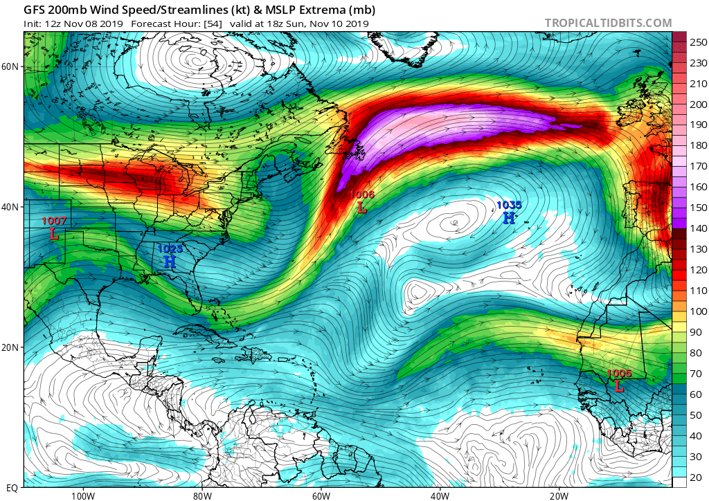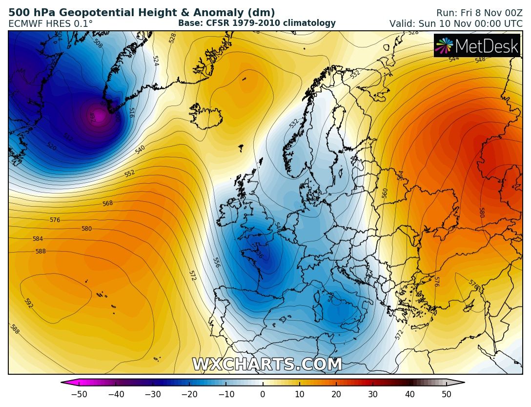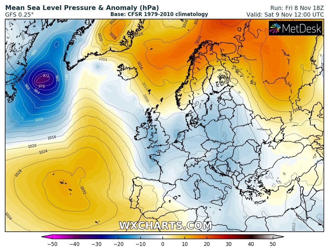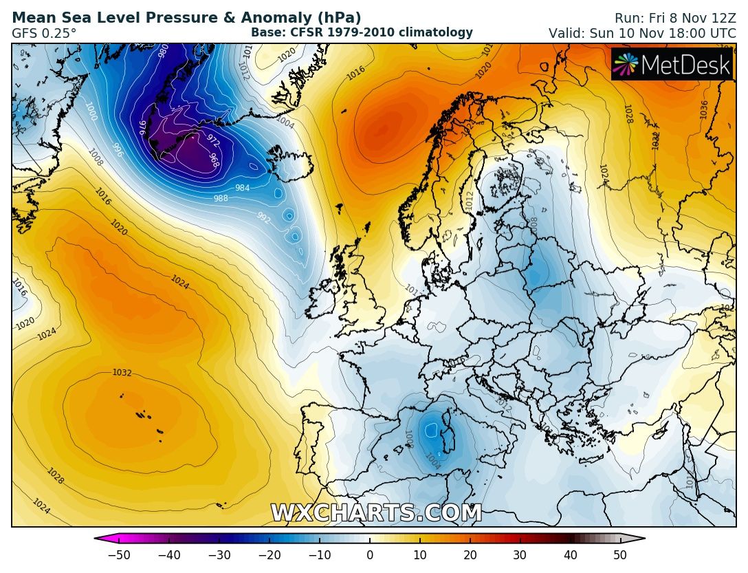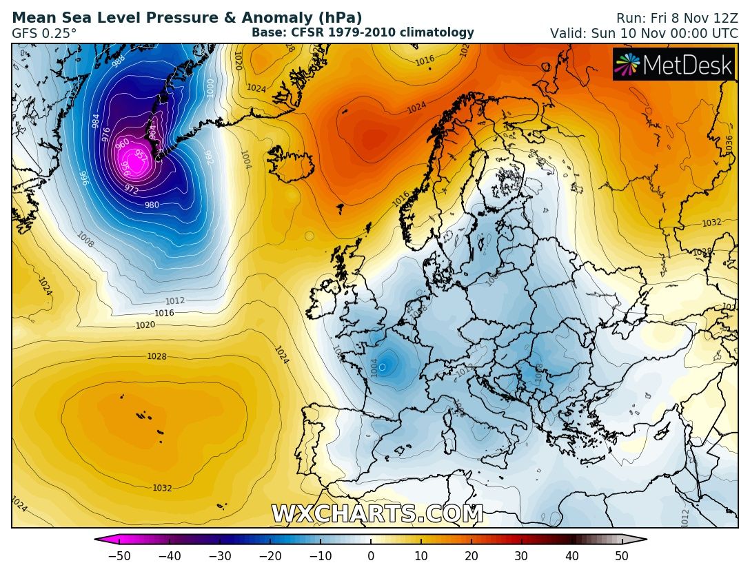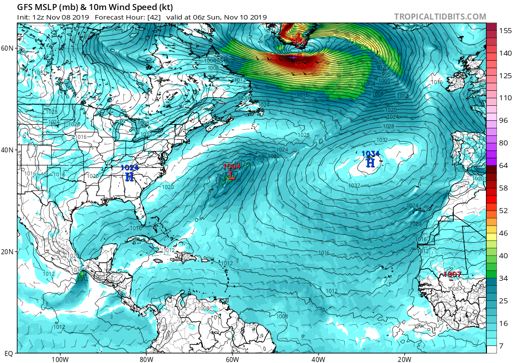 NOAA OPC forecast for the North Atlantic on Sunday, Nov 10th 12 UTC – a very intense windstorm with hurricane-force winds is expected. The center of the low will be just to the east of the southern tip of Greenland.