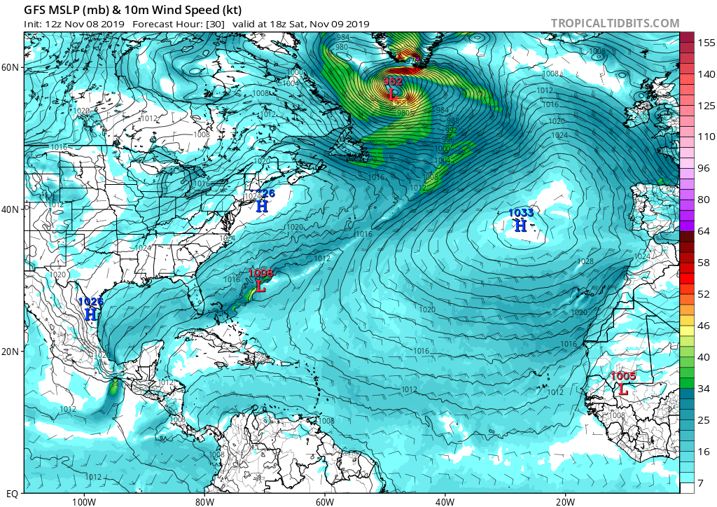 Cyclone will begin rapidly deepening on Saturday, Nov 9th around 12 UTC and continue for 24 hours, becoming a very intense cyclone. Notice the very tight pressure gradient around the low, resulting in hurricane-force winds just south of the cyclone’s center and also over the SW Greenland terrain slopes. Central pressure should drop below 950 mbar!