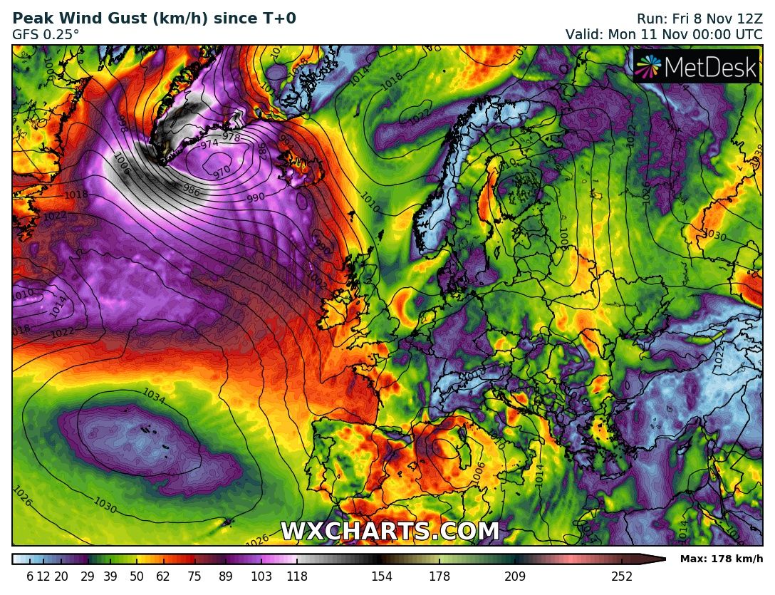 Autumn is usually very active over the North Atlantic where cold Arctic outbreak push over the still warm seas and result in explosive cyclogenesis and violent windstorms. Yet another bombogenesis* cyclone will develop over the Labrador Sea tomorrow, Saturday, Nov 9th and turn east towards the extreme southern tip of Greenland on Sunday while rapidly deepening. An intense windstorm is expected around the cyclone’s core and also across the southern Greenland where a combination of the cyclonic wind field and downslope winds should result in extremely severe winds, locally reaching 150-200 km/h, or even higher in the most exposed areas.