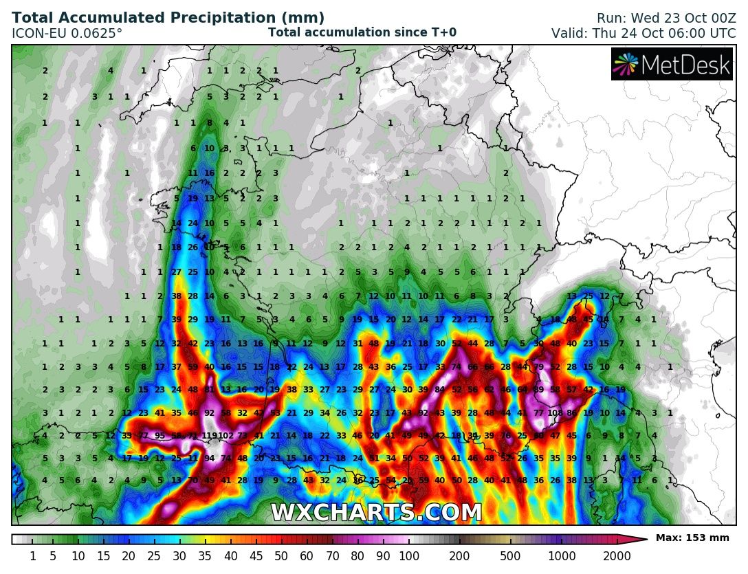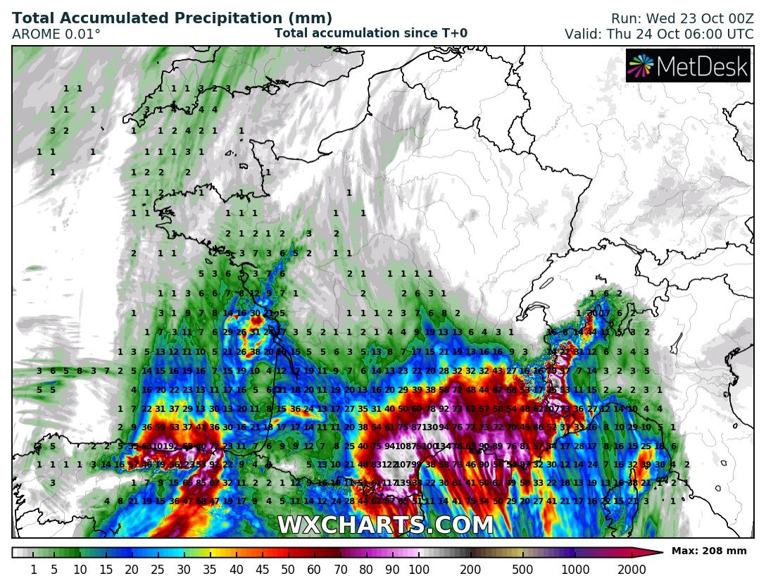 Various models ICON-EU, ARPEGE and AROME and hinting up to near 200 mm of rainfall across S France and NW Italy within the next 18-24 hours. A combination of convective and orographic precipitation should lead to high rainfall sums. Severe storms could also support tornadoes and severe winds.