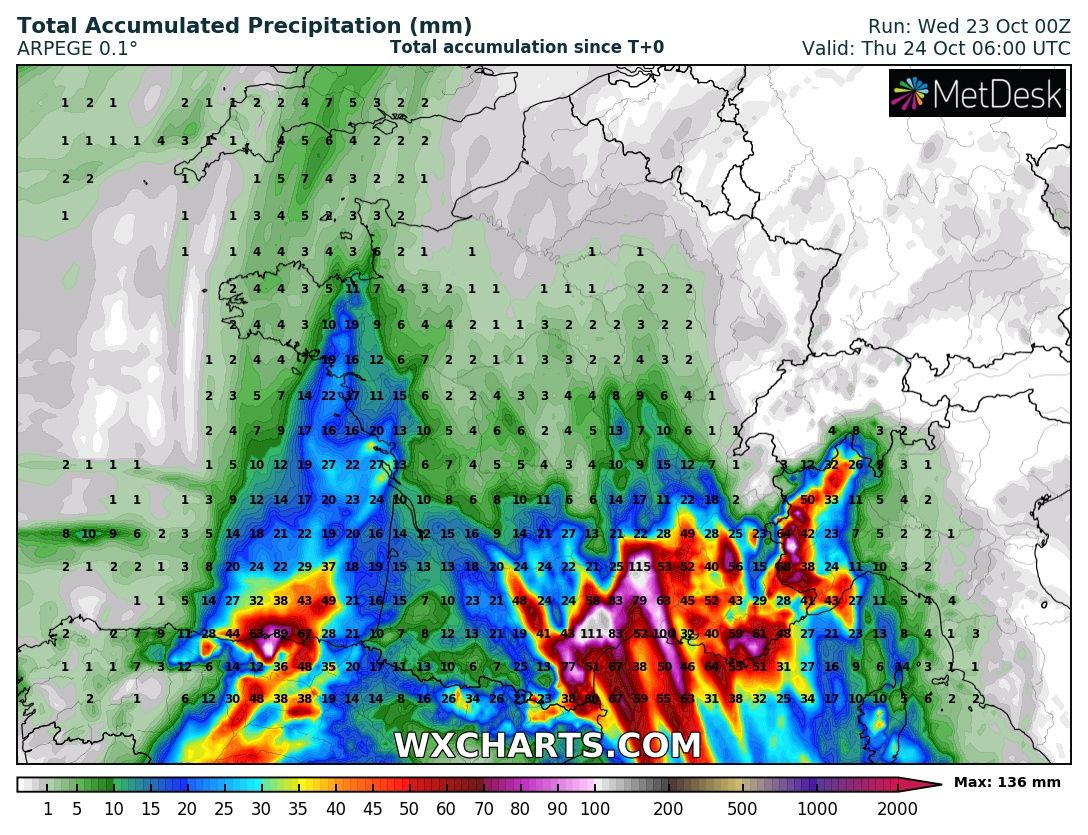 Widespread convective storms are ongoing across the western Mediterranean today, resulting in intense and excessive rainfall into southern France. Activity is gradually spreading east towards NW Italy. Locally up to near 200 mm is possible until tomorrow morning, Thursday, Oct 24th!