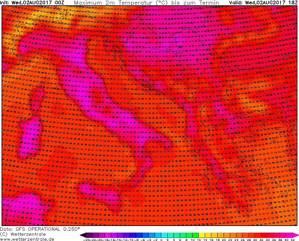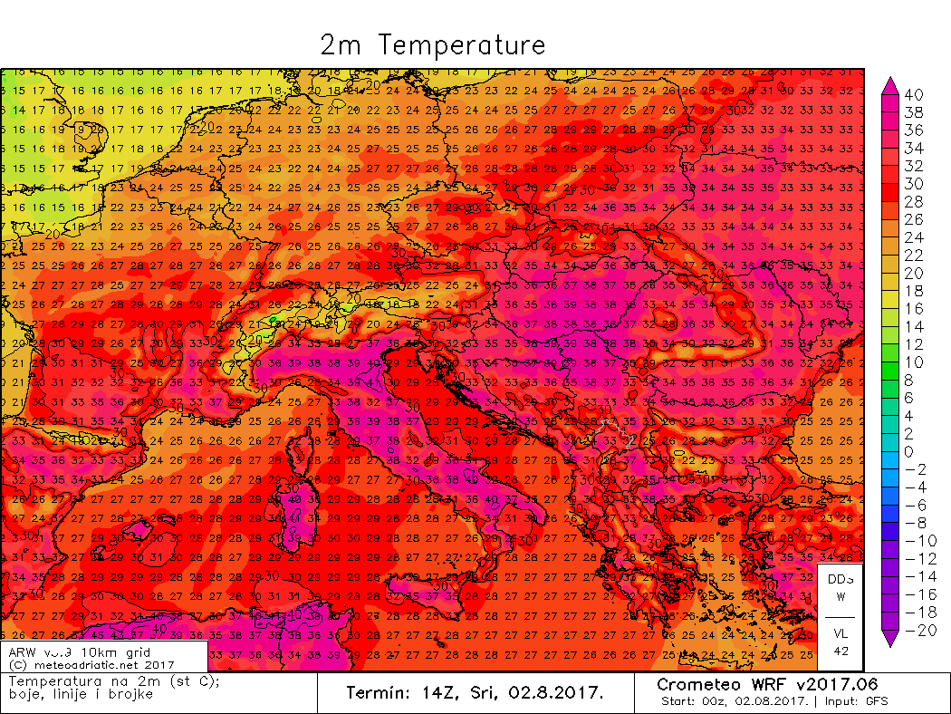 Today, the highest temperatures are again expected across parts of Italy and Balkan peninsula, while the Iberian peninsula and southern France can expect slightly cooler weather than yesterday as trough made some slight progress eastwards and mixed down the temps a bit. However, peak temperatures in the eastern Po plain (N Italy) are expected to reach 38-42 °C, together with locally high dewpoints near 25°C – so very high Heat Index! Some parts of south-central Italy and Sardinia also expect temperatures in range 37-41 °C locally! The Pannonian basin, including Hungary, E Croatia, N Serbia and W Romania are also expected to reach up to 35-39 °C, while some interuption with storms from the Alps should limit peak time heating in the afternoon. Also very hot in parts of southern Balkans and W Turkey, going up to 40 °C locally again.