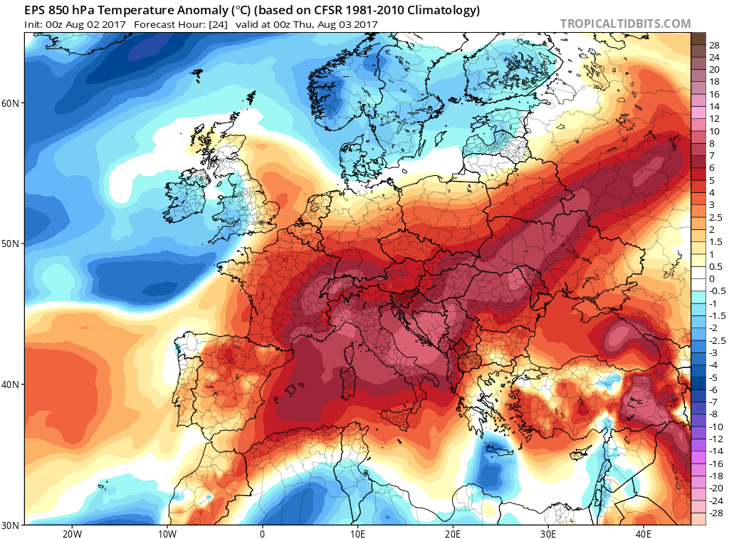 Europe is still divided in two halfs with much cooler temps across W Europe and hot weather further ESE with deep trough over W Europe and an intense ridge over ESE Europe. Much of south, central and eastern Europe will experience well above average day with extremely hot temperatures locally. A cooler period remains across western amd northern Europe in the wake of the troughs.