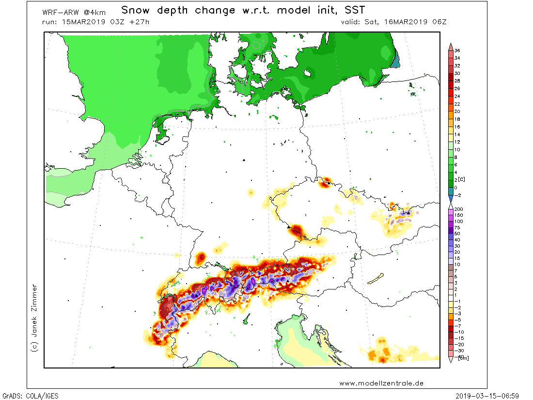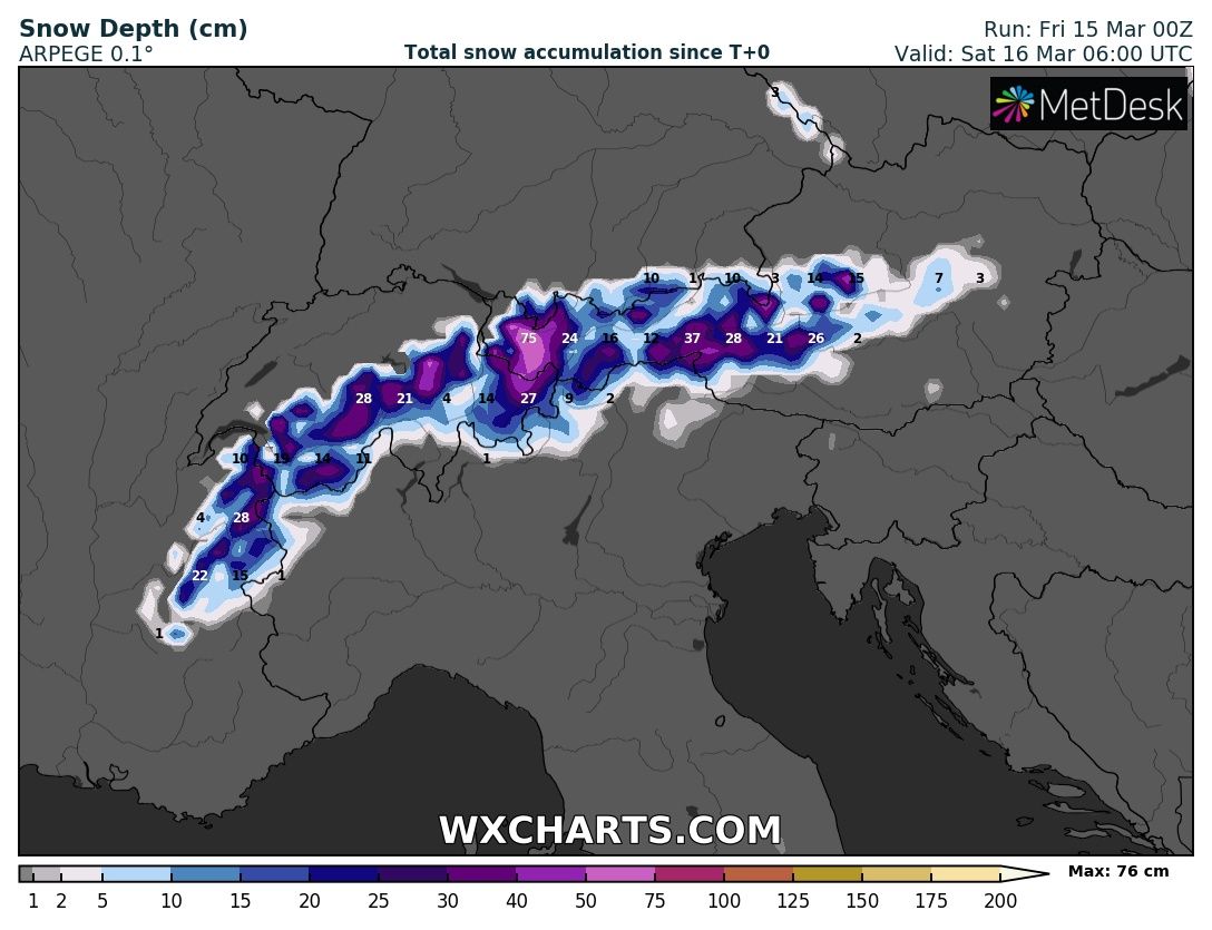 Quite a lot of snow is expected across parts of the Alps this weekend as excessive snowfall event establishes. Most snow with total amounts above 75 cm is expected across the west-central Alps (western Austria and southern Switzerland).