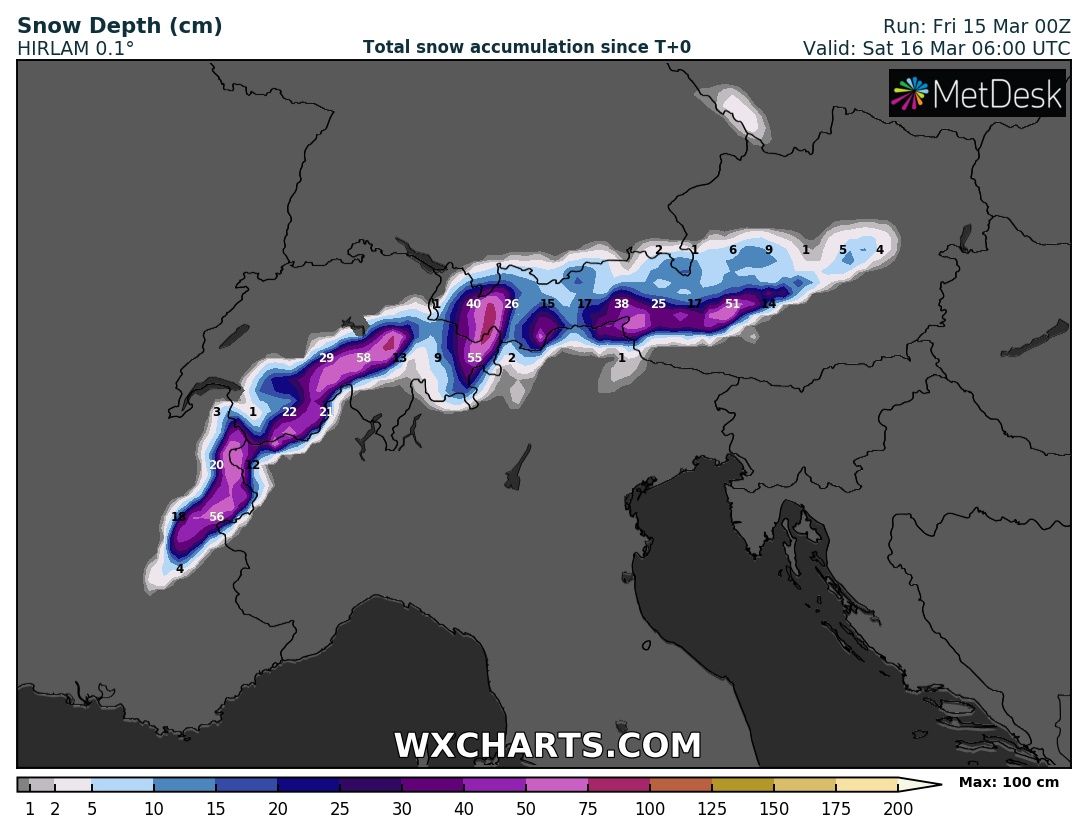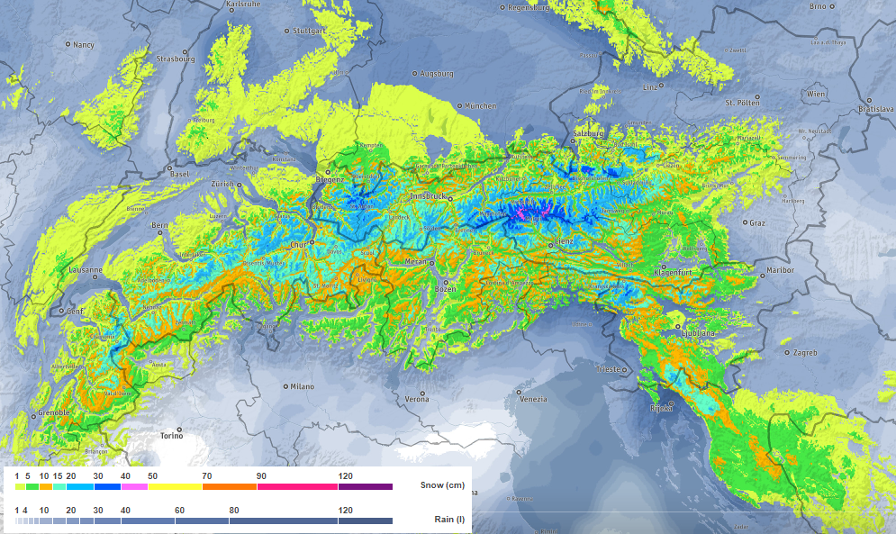 Various models are suggesting locally 50-100 cm of fresh snow is likely through the next days at higher elevations in the Alps.