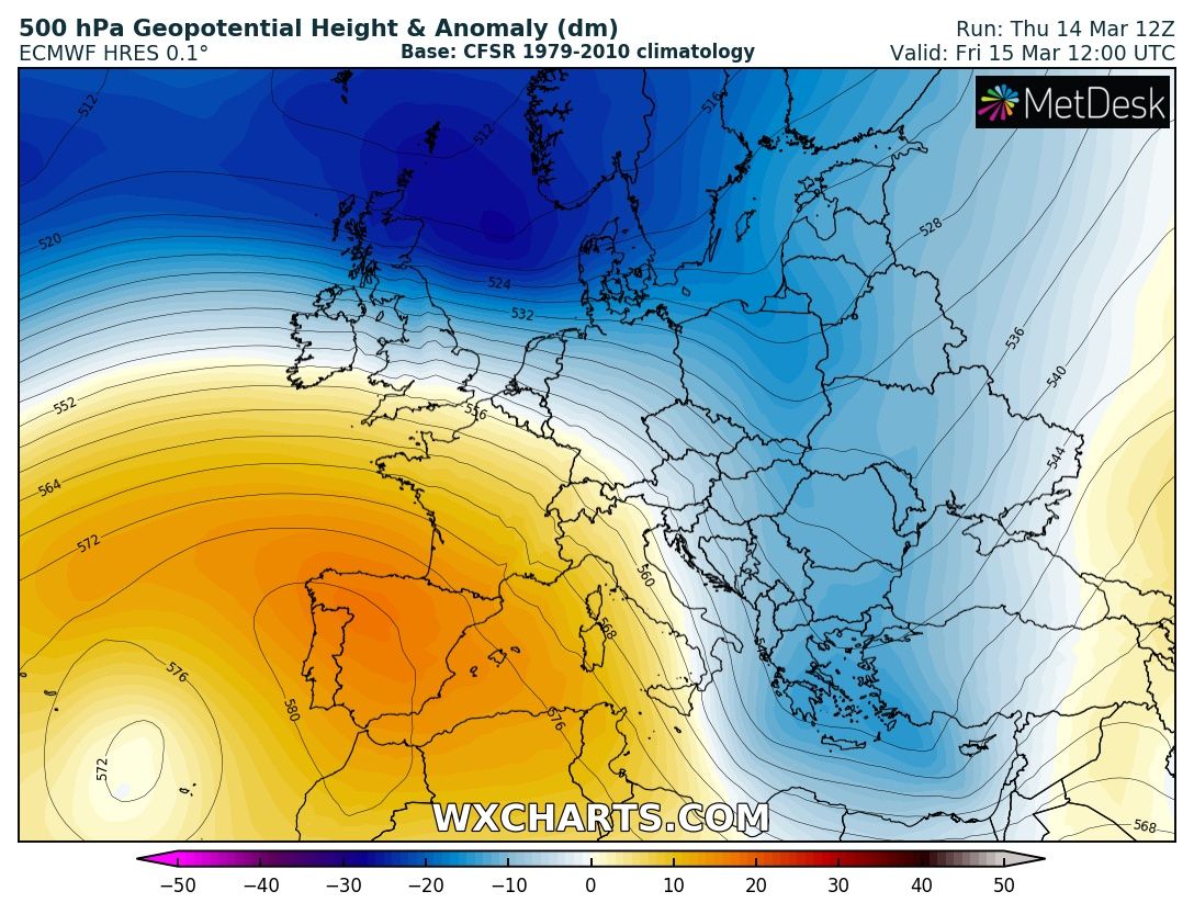 The pattern is characterized by a strong ridge over southwest Europe anda deep trough over east and north Europe, resulting in strong NW flow in between. This brings persistent orographic lifting and moisture advection into the NNW Alps.