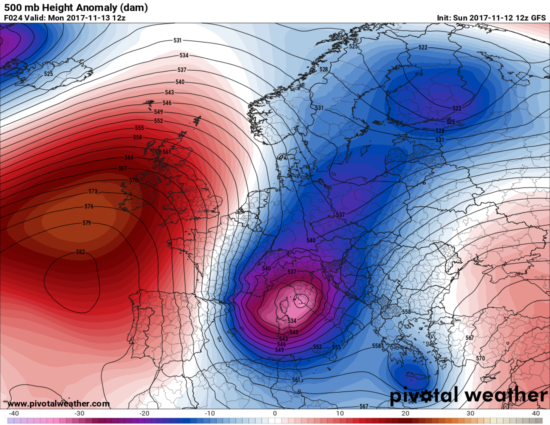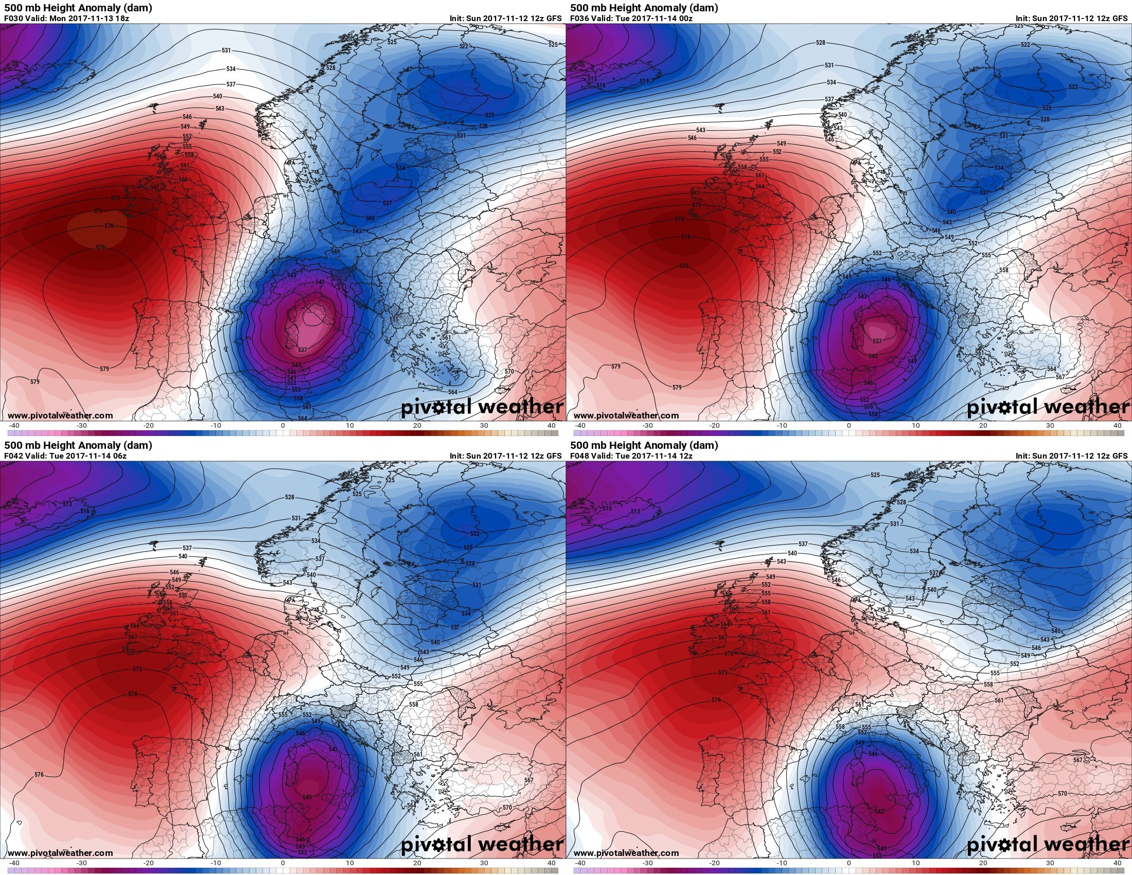 Evolution of the cutoff low over the north-central Mediterranean on Monday and early Tuesday. Map: Pivotalweather.com.