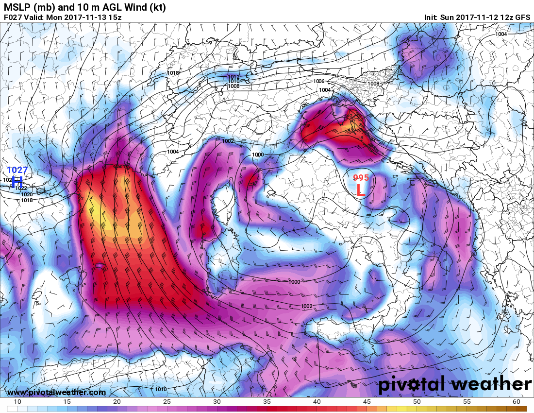 Surface winds across the Mediterranean region. GFS model guidance for Monday afternoon. Note the surface low over the north-central Adriatic sea. Map: Pivotalweather.com