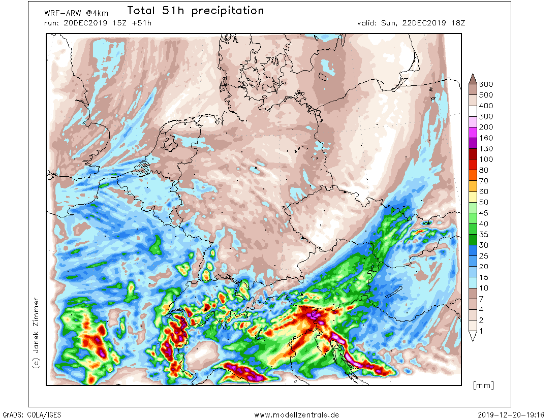 A persisting SW flow and cold temperatures in the higher Alps will support an intense orographic snowfall, especially over the west-central Alps on both systems, therefore resulting in an excessive amount of snow in some areas. Snowline will be lower during the second system as some cold advection will overspread the Alps after the first wave. Models are in fairly good agreement in a major snowfall event, locally bringing more than 150 cm of fresh snow by Monday morning, Dec 23rd!