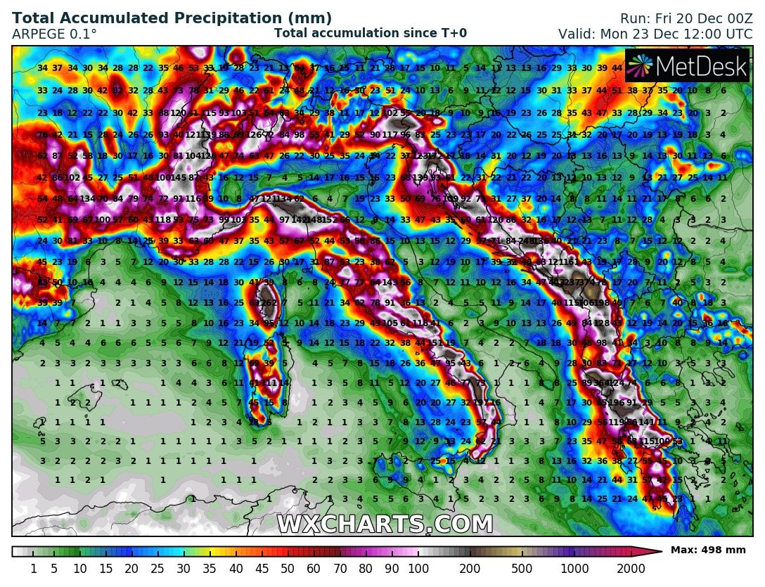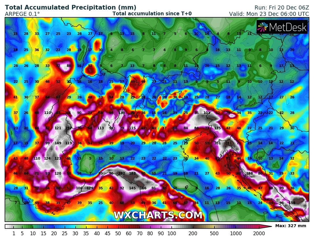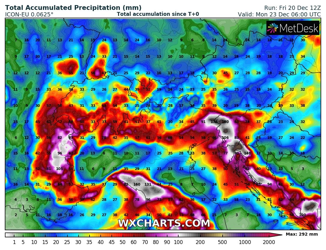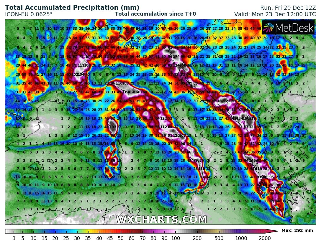 Here is an overview of rainfall sums across the Mediterranean, indicating strongly orographic rainfall is expected along the whole mountain range of Apennines and Dinarides across W Balkans. Huge amounts of rain are also likely across Corsica. Some classic locations will receive up to around 300+ mm of rain, possibly even more in the favorite spot e.g. mountainous Montenegro where potential exists for up to around 500 mm of rainfall until Monday.