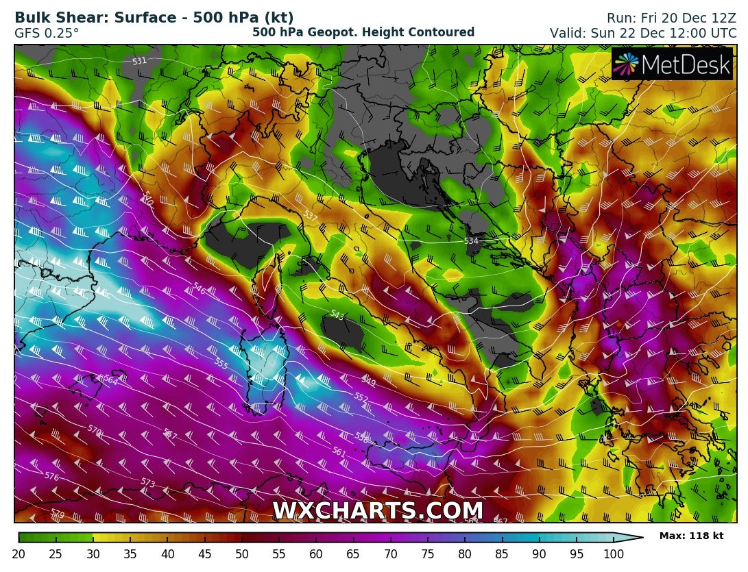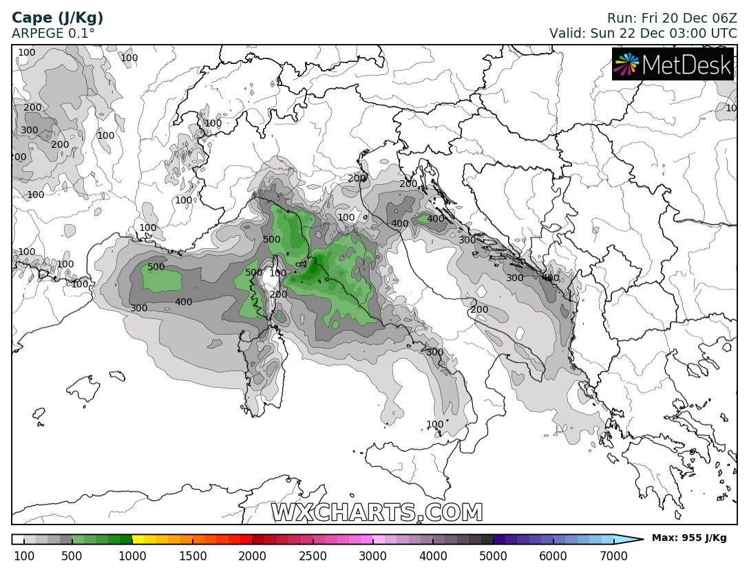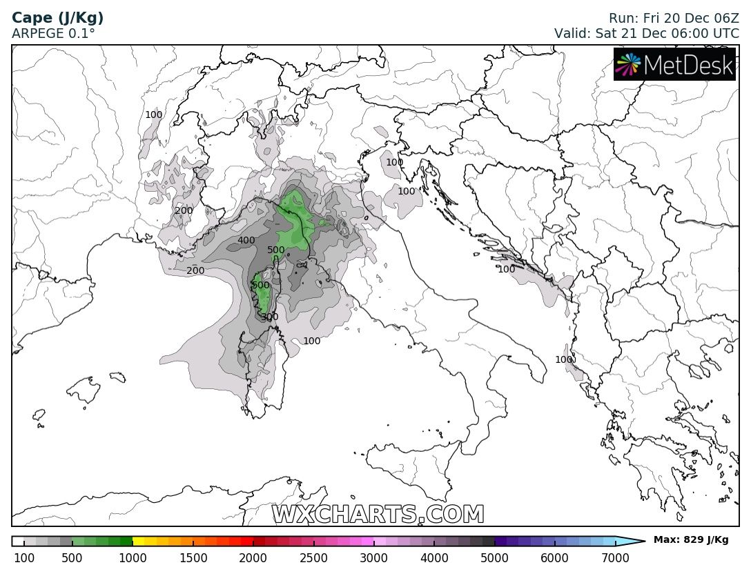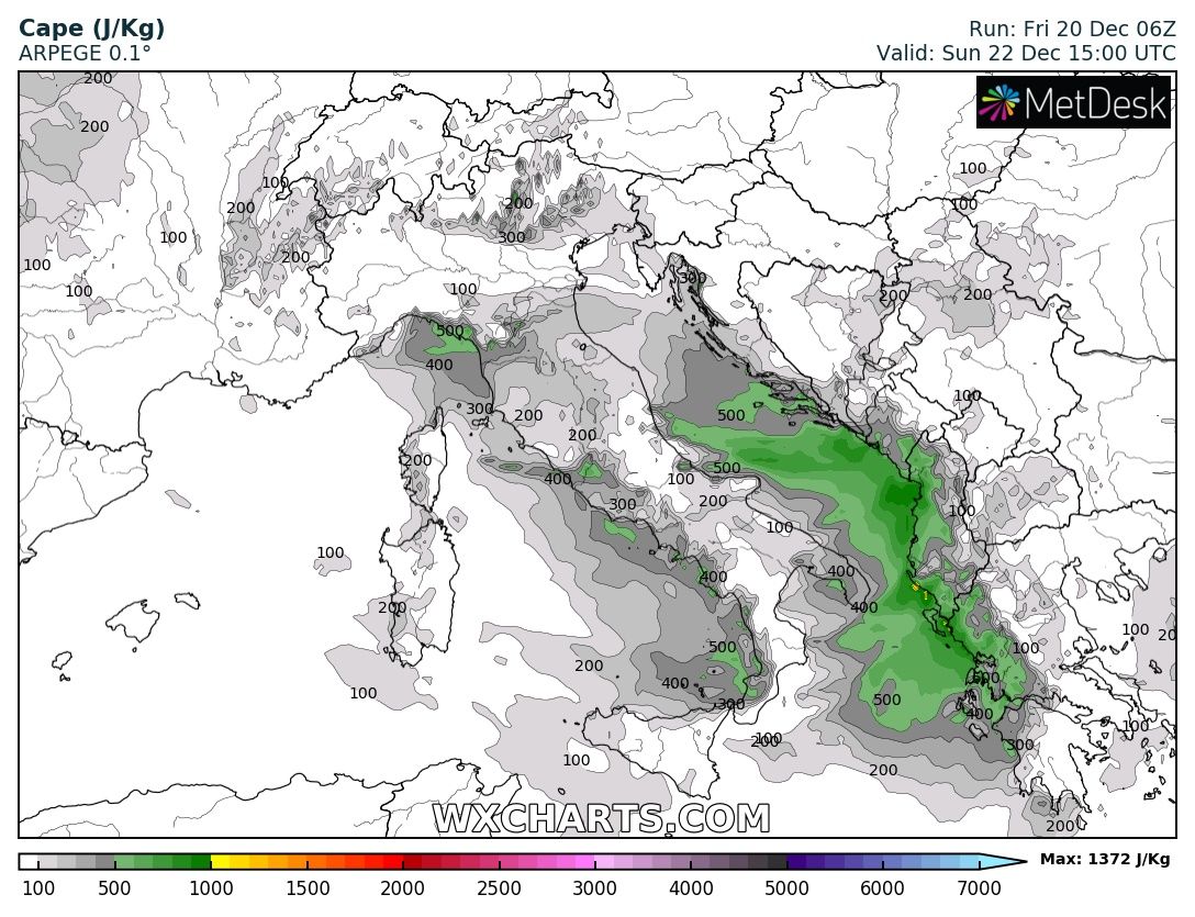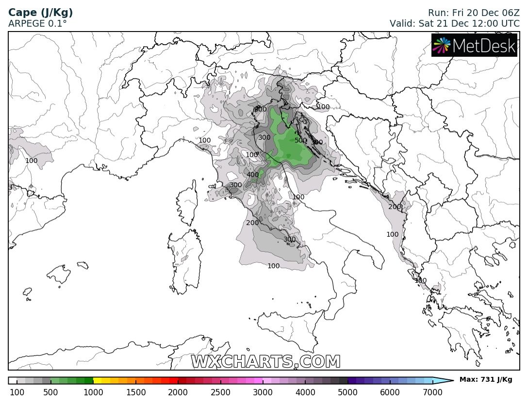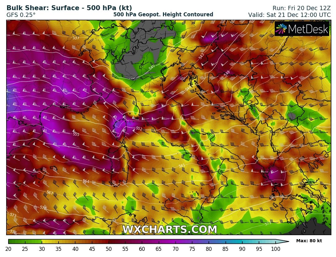 The first wave and an associated frontal system is entering the western Alps and NW Italy tonight, with a cyclone forming over north Italy and moving across the Adriatic sea towards the western Balkans tomorrow, Saturday, Dec 21st. A very large system brings a strong southwesterly jet stream, providing large scale lift and shear over the region. Warm advection in the lowest levels will also enhance instability, first over the Ligurian Bay in the morning and later on over the Adriatic sea tomorrow afternoon, supporting convective storms and potentially also some severe storms with severe winds, torrential rainfall and tornado threat. Heavy rainfall is expected, locally enhancing flooding threat due to training-cells effect and rainfall persisting across the same areas for a longer period of time.