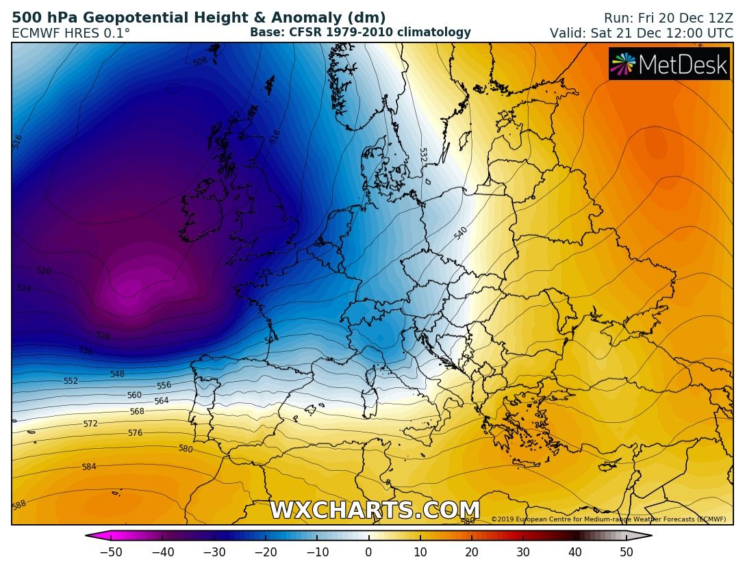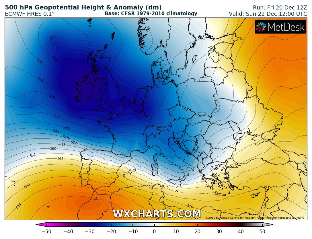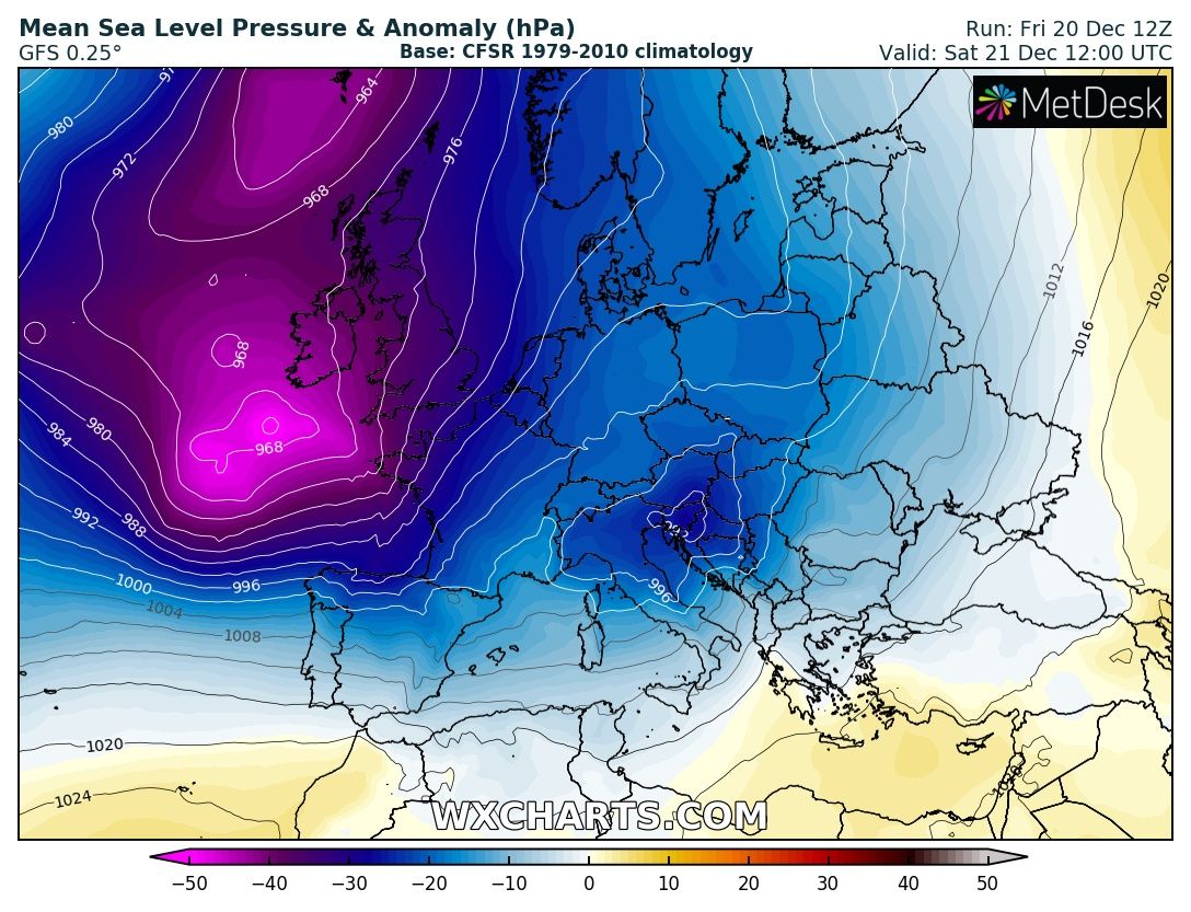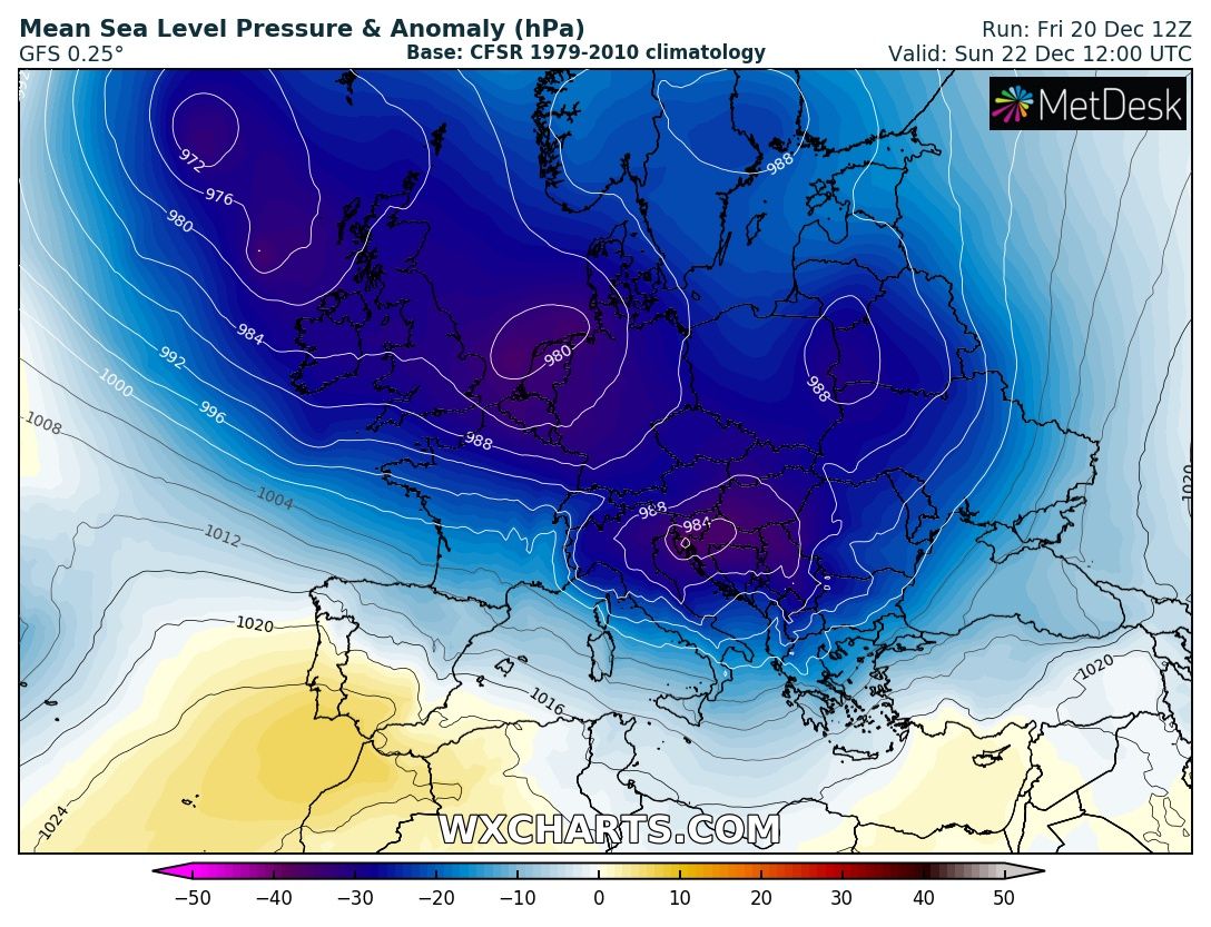 The extensive ridge across east-central Europe is getting replaced by a very large trough over the Atlantic, gradually expanding into to western half of the European continent this weekend. This will result in two consecutive deep cyclones across the Alps and northern Mediterranean, delivering a huge amount of rainfall (200-300 mm) and extreme snowfall (150+ cm over the west-central Alps) with significantly enhanced flooding threat, as well as avalanche threat in the Alps.