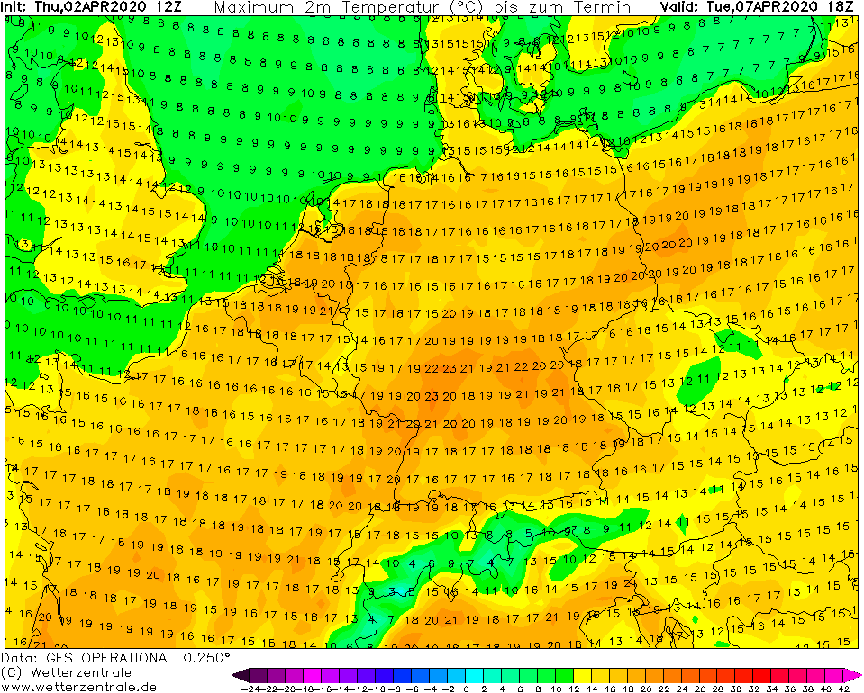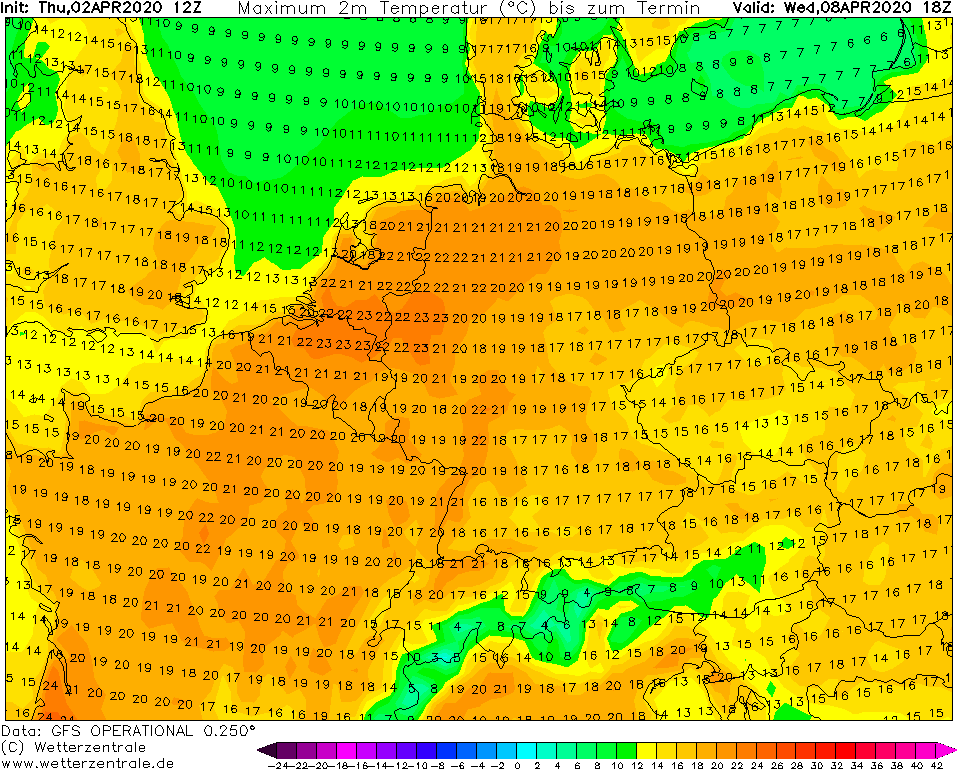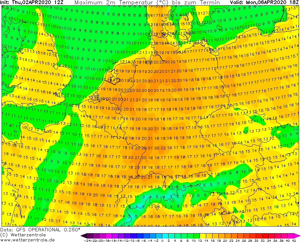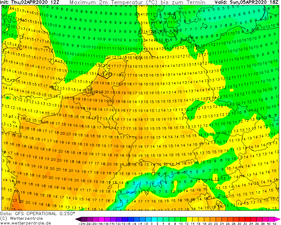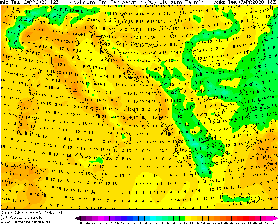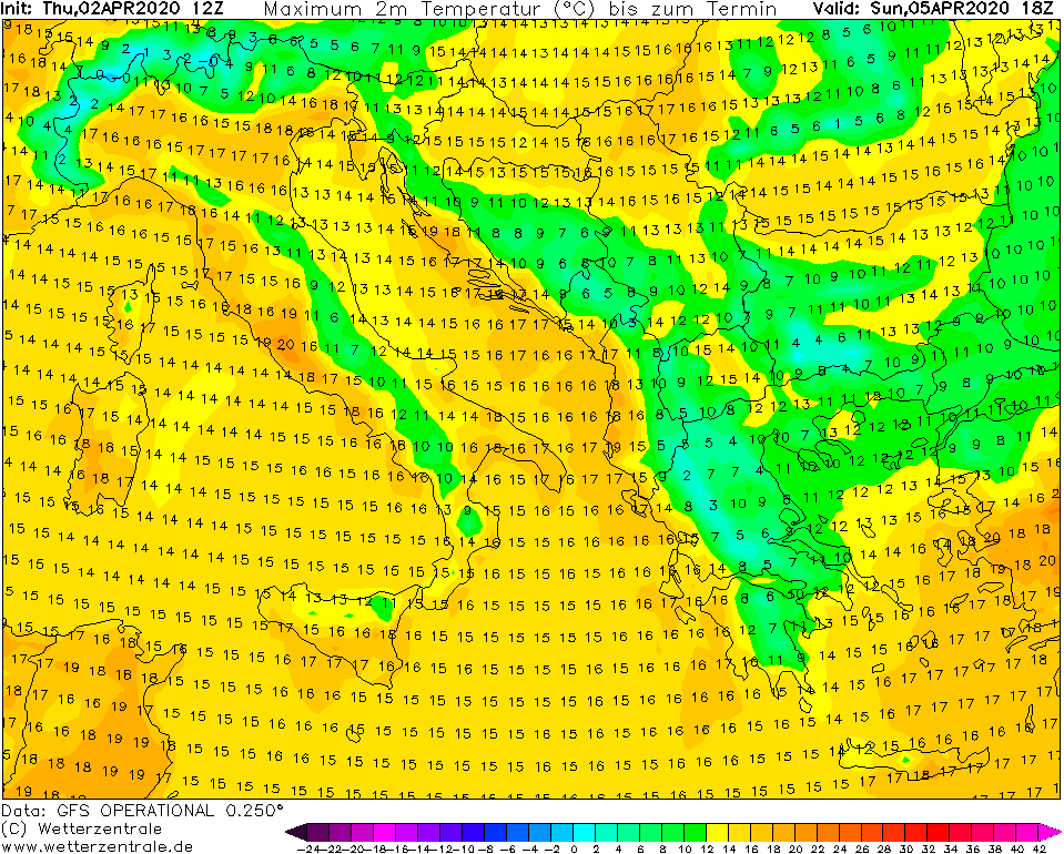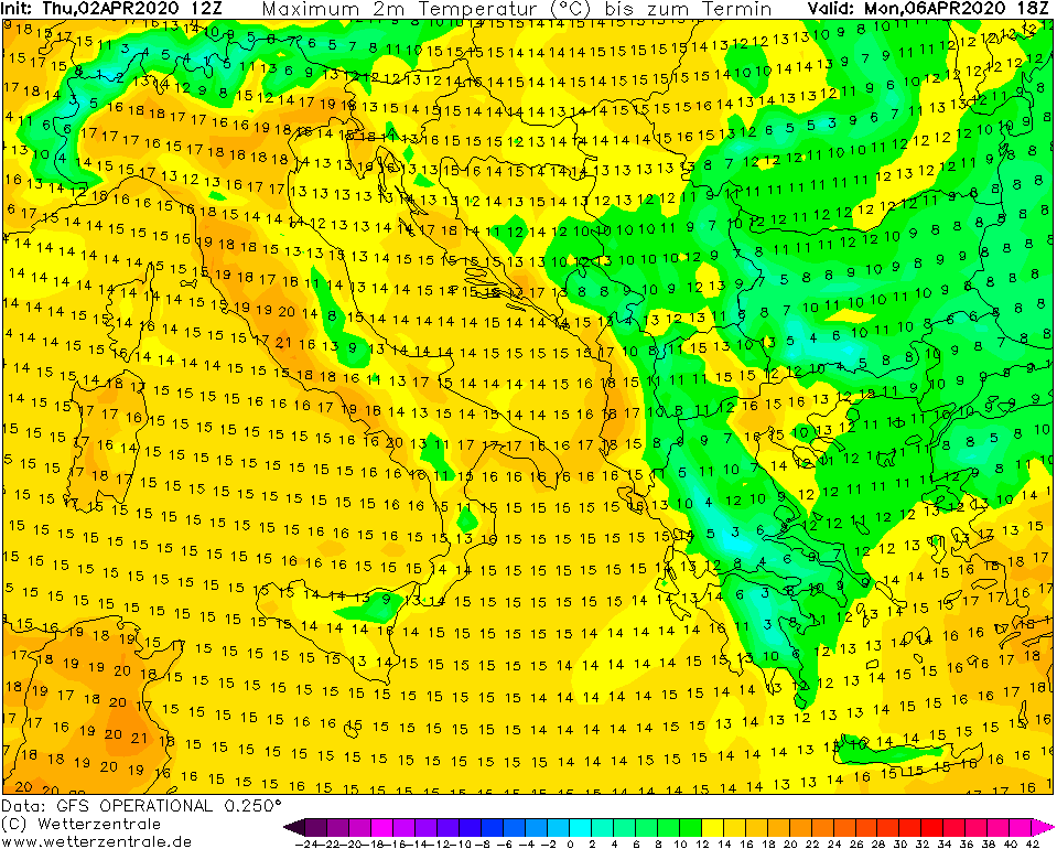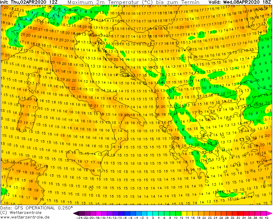 This pattern change will finally end of this dangerous period with damaging morning frosts ongoing this week. A much warmer weather will indeed bring spring time afternoon temperatures, exceeding 20 °C in many areas. Even higher than 25 °C is possible in some areas. Attached are peak afternoon tempertures from Sunday through Wednesday across west-central and southern Europe. We can also see the southern Balkans will have rather cold days until the cold pool maintains over there: