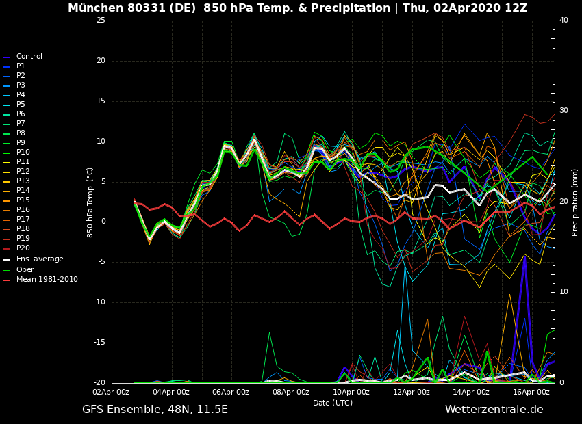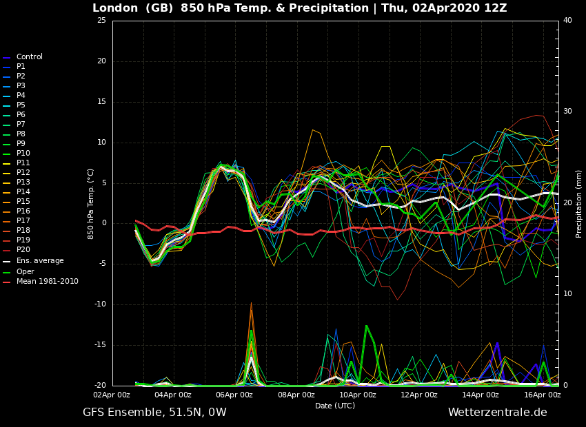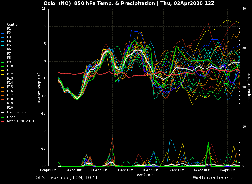 Here are the long-range meteograms for London (S England), München (S Germany) and Oslo (S Norway), all revealing the next week will be much warmer than normal for early April.