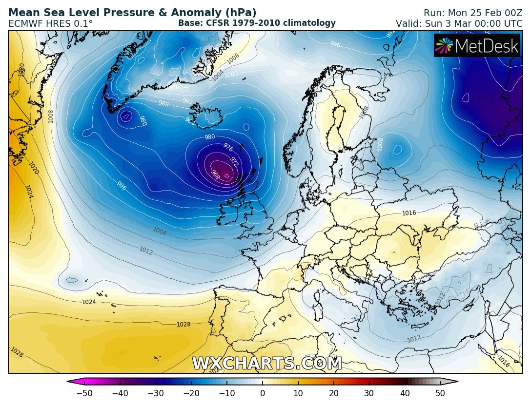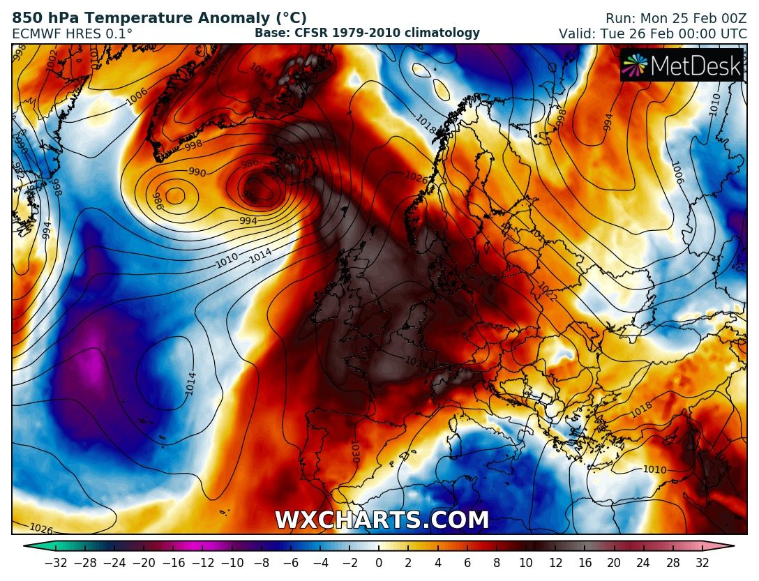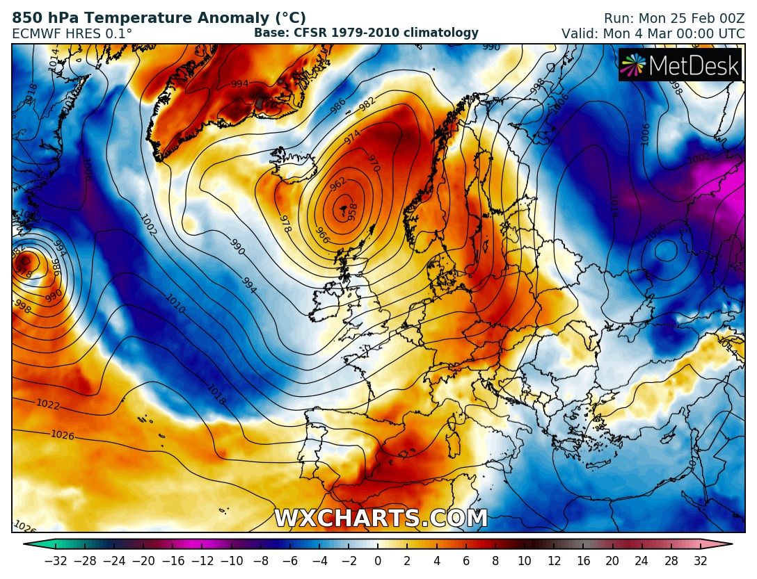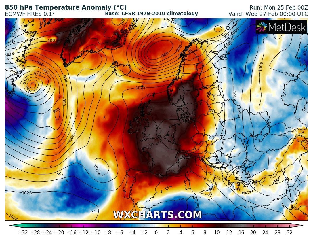 A deep trough establishes across western Europe with a very intense cyclone pushed across Scotland and Faroe Islands towards Scandinavia. Warm advection ahead of the low spreads into the Baltic region and Scandinavia while the associated cold front pushes towards central Europe and the Iberian peninsula.