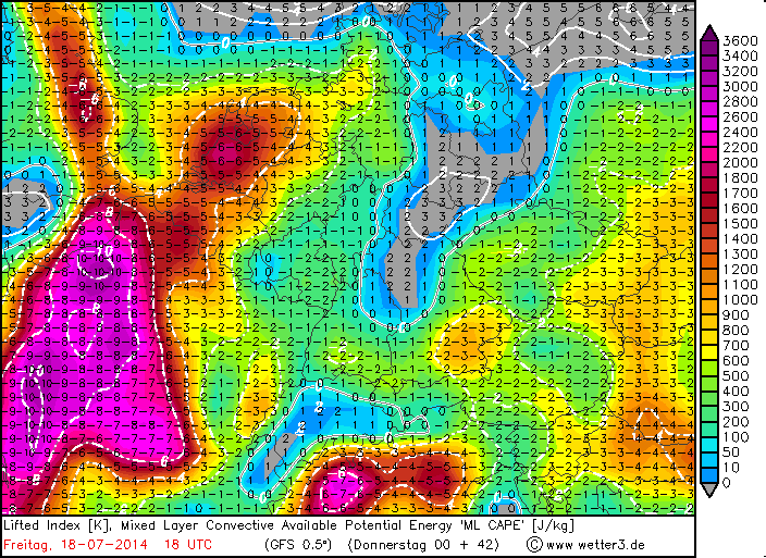 Instability forecast for Friday July 18th, extreme amounts of CAPE over France. Source: wetter3.de