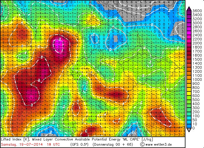 Instability forecast for Saturday July 19th. Very strong CAPE over France and Benelux. Source: wetter3.de
