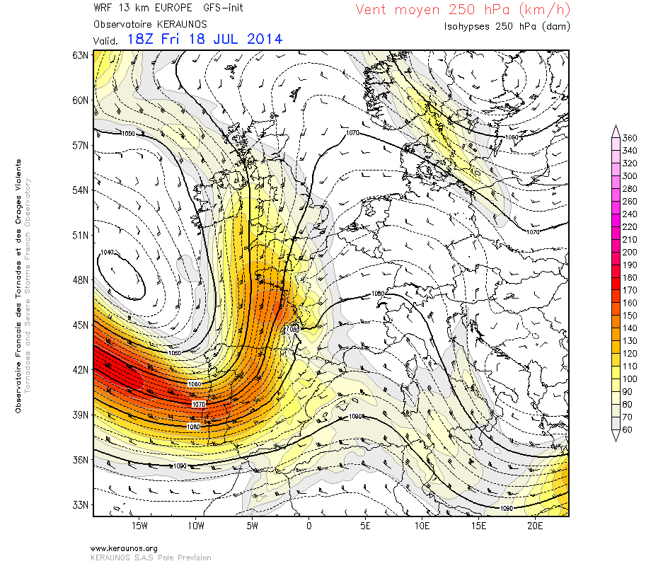 Upper level winds for Friday July 18th. Powerful jet streak is pushed into western Europe. Source: keraunos.org