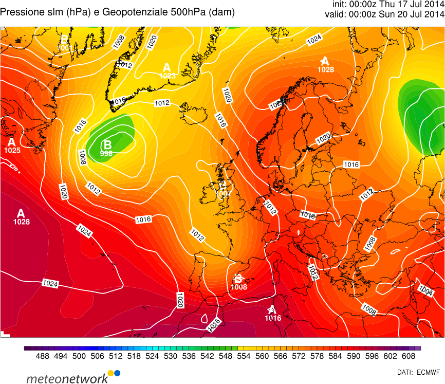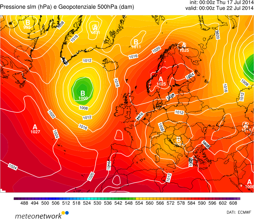 500mb geopotential analysis for Monday July 21st. A negative tilted upper trough transforms into upper low over northern Mediterranean. Source: meteonetwork.it