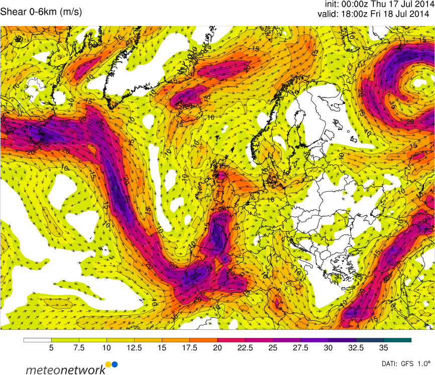Deep-layer shear forecast for Friday July 18th afternoon; Around 50-70 knots will be available over France; Source: meteonetwork.it