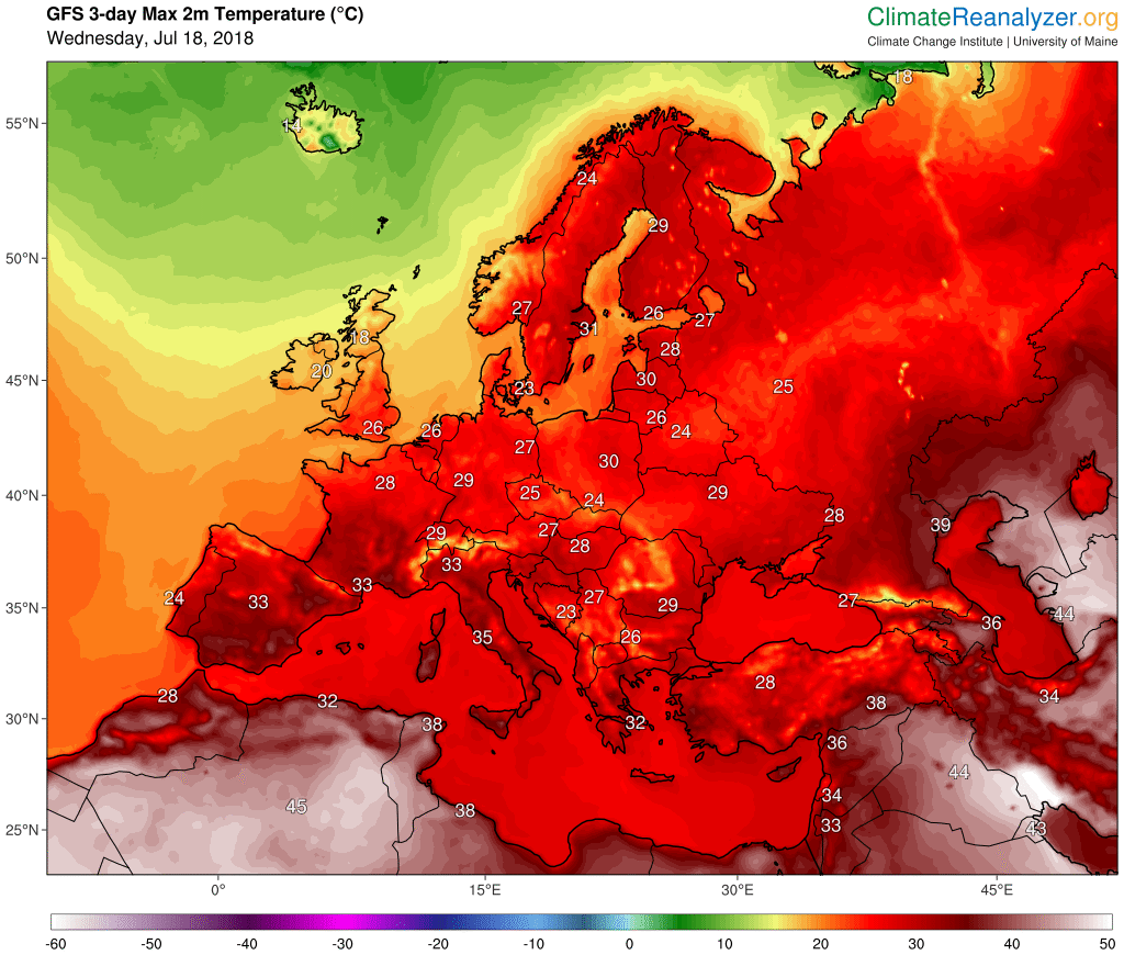 Yesterday was another exceptionally warm day across northern Europe, with temperatures again pushing well above 30 °C far inside the Arctic circle. The entire region has been experiencing an exceptionally warm spell for over a month.