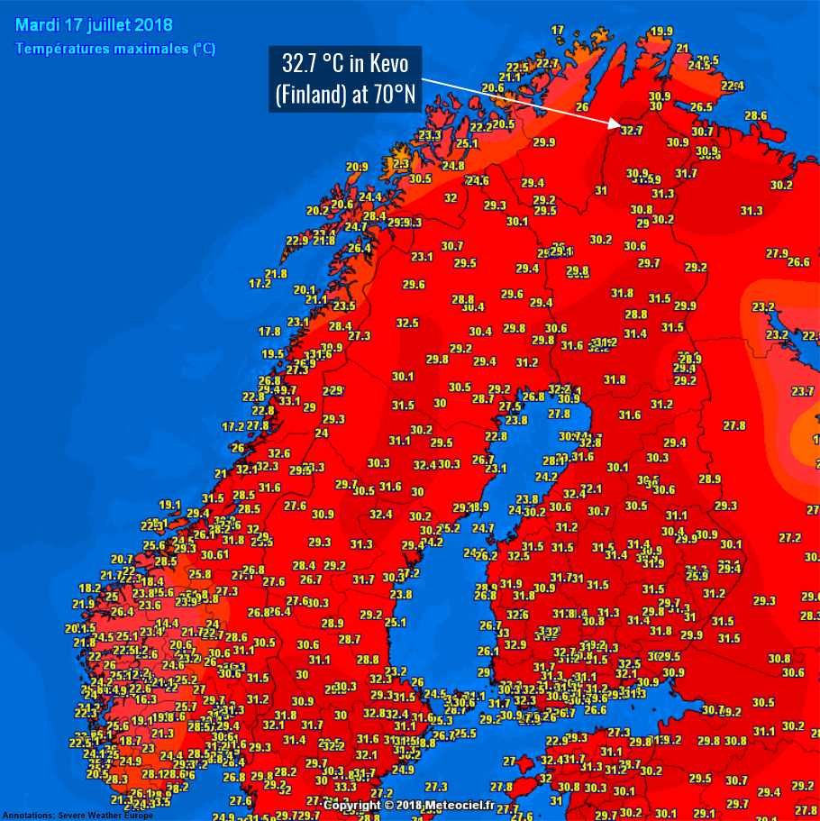 Tana Bru (Norway) at 70.2°N reached 30.9 °C. Kevo (Finland) at 69.8°N pushed up to 32.7 °C. These locations are way up in the extreme north of northern Europe, well north of the Arctic circle. Temperatures peaked well over 30 °C across large parts of the region.