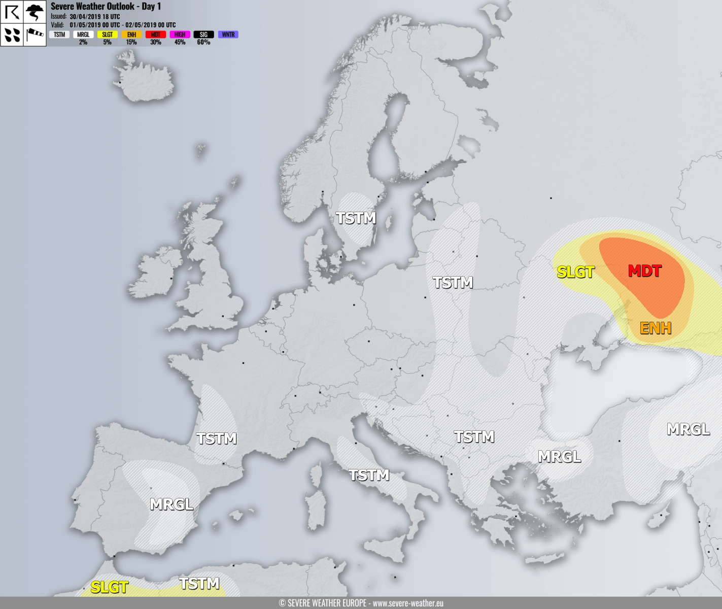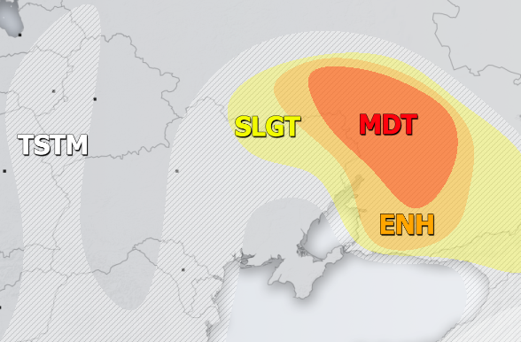ENH / SLGT risks have been issued for E/N Ukraine into SW Russia and N Georgia with more isolated threat for severe storms, capable of producing large hail, severe winds and torrential rainfall. The tornado threat is also a concern across the northern parts of the risk areas where best LL helicity overlaps with moderately strong instability.