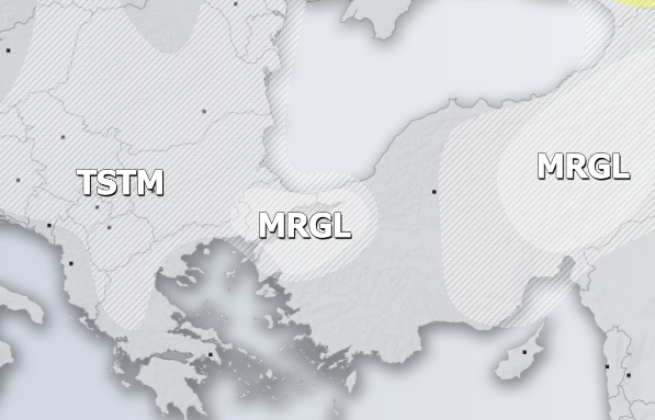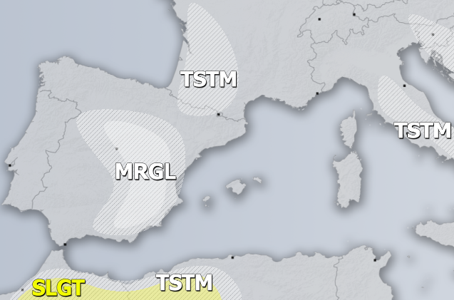 MRGL risks have been issued for ESE Spain, NW and E Turkey with isolated threat for severe storms, capable of producing severe winds, marginal hail and heavy rainfall. Strongest cells in Spain could bring accumulated hail as storms will be quite slow moving.