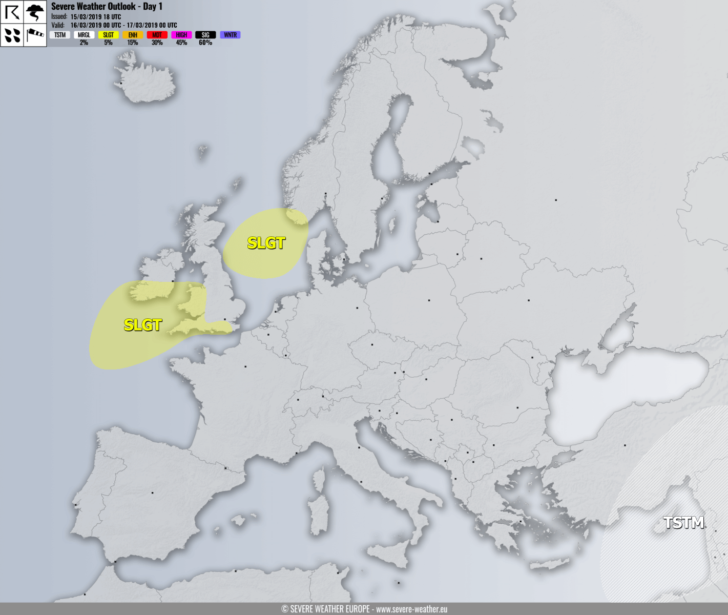 SLGT risk has been issued for the North Sea and extreme S Norway with threat for severe non-convective wind gusts in excess of 100 km/h.
