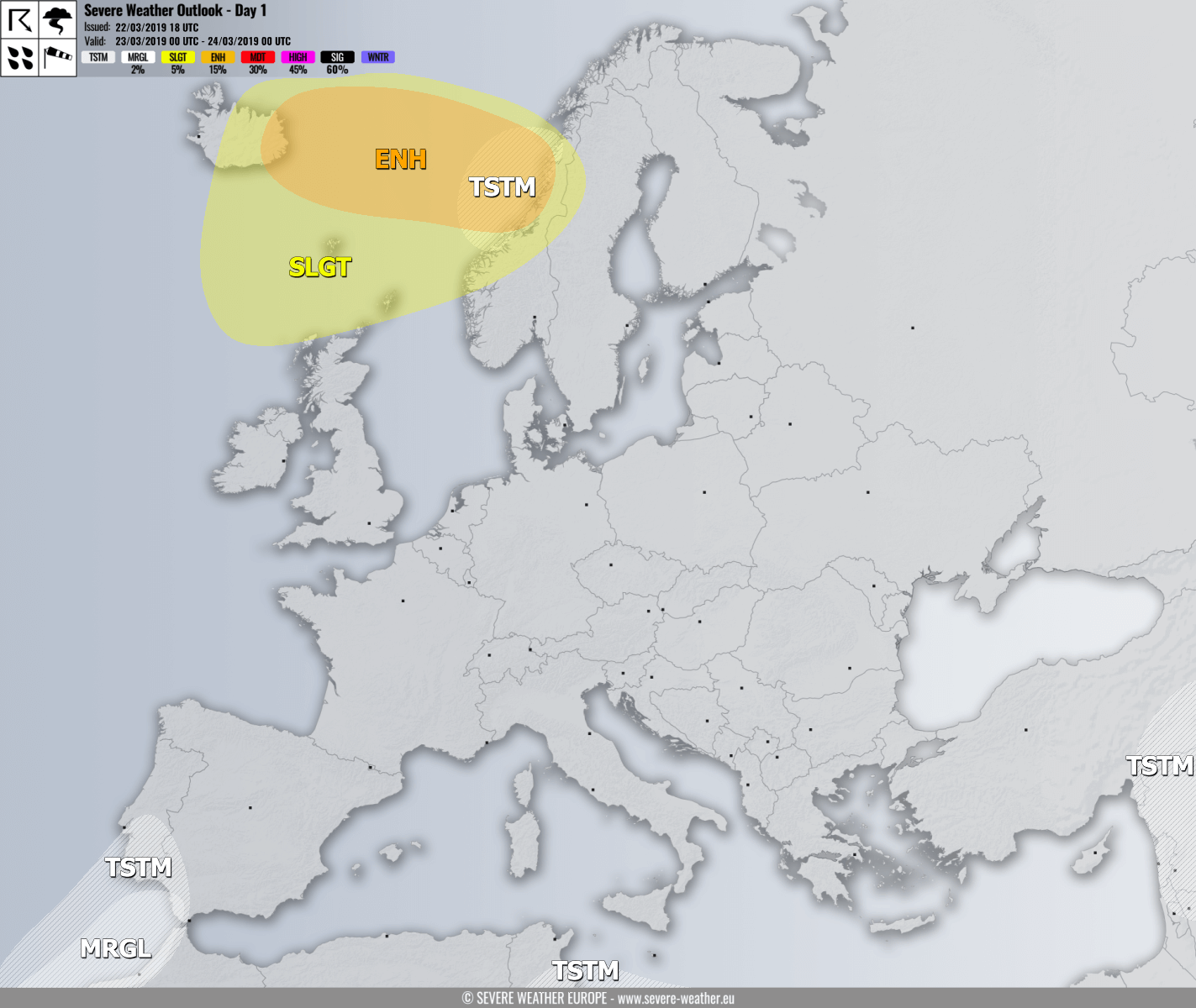 SLGT risk has been issued for areas surrounding the ENH risk including south, central and north Iceland, Faroe islands, N Scotland, parts of Norway and NW Sweden with threat for severe winds, locally in excess of 100 km/h.
