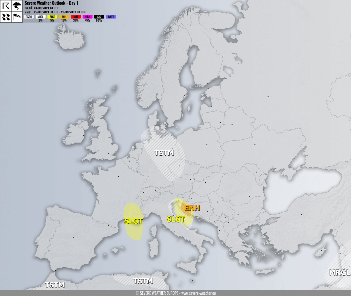 ENH and SLGT risks have been issued for SW Slovenia, N Adriatic and NW Croatia (Kvarner region) with threat for severe to extremely severe downslope Bora winds, locally in excess of 110-130 km/h. In the evening hours, rain will likely turn into snow across elevated terrain of SW Slovenia and NW Croatia where blizzard conditions are likely to develop as well.