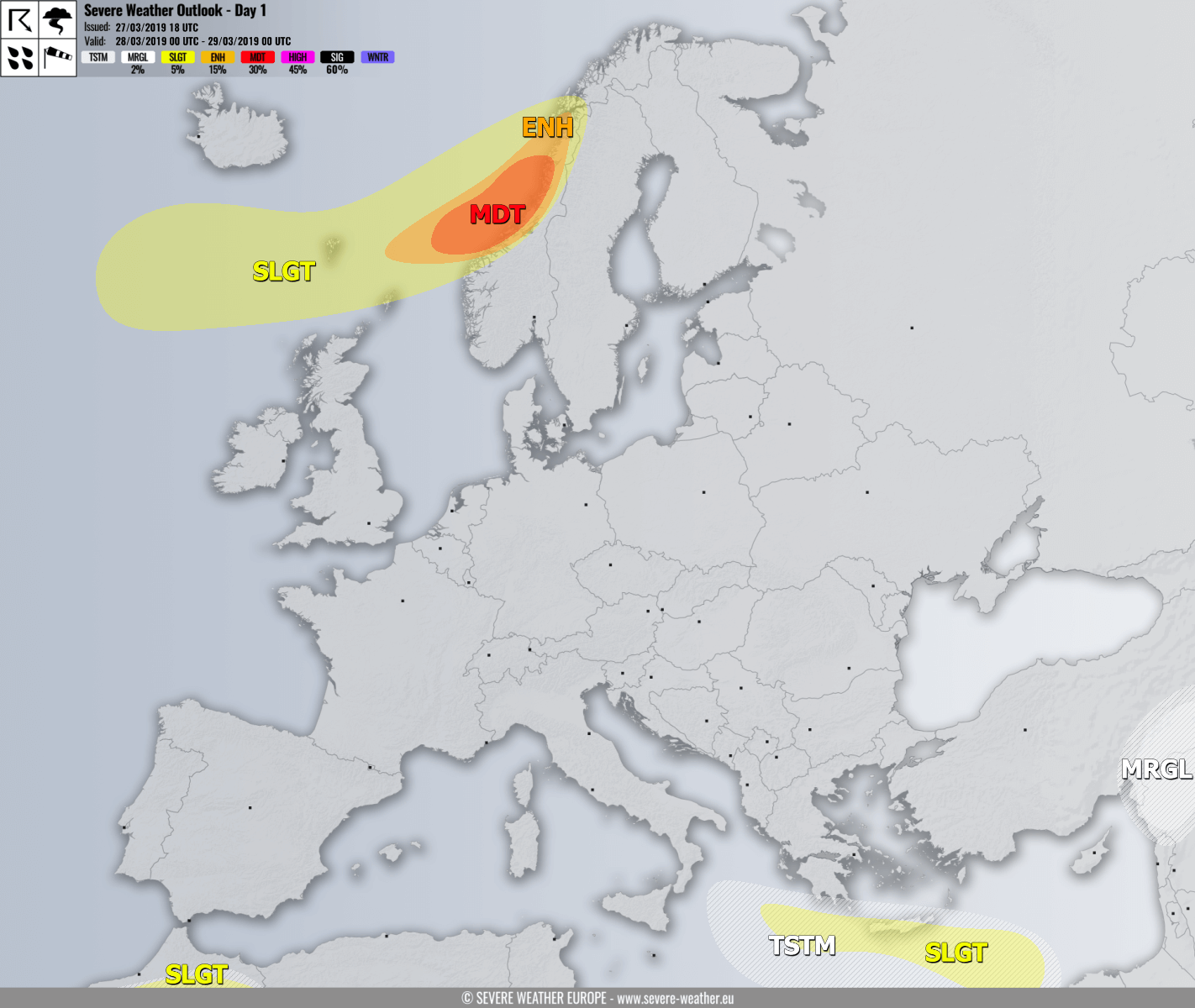 SLGT risk has been issued for areas surrounding MDT / ENH risks including Faroe islands, Lofoten and parts of the N Atlantic where severe winds in excess of 100 km/h are possible.