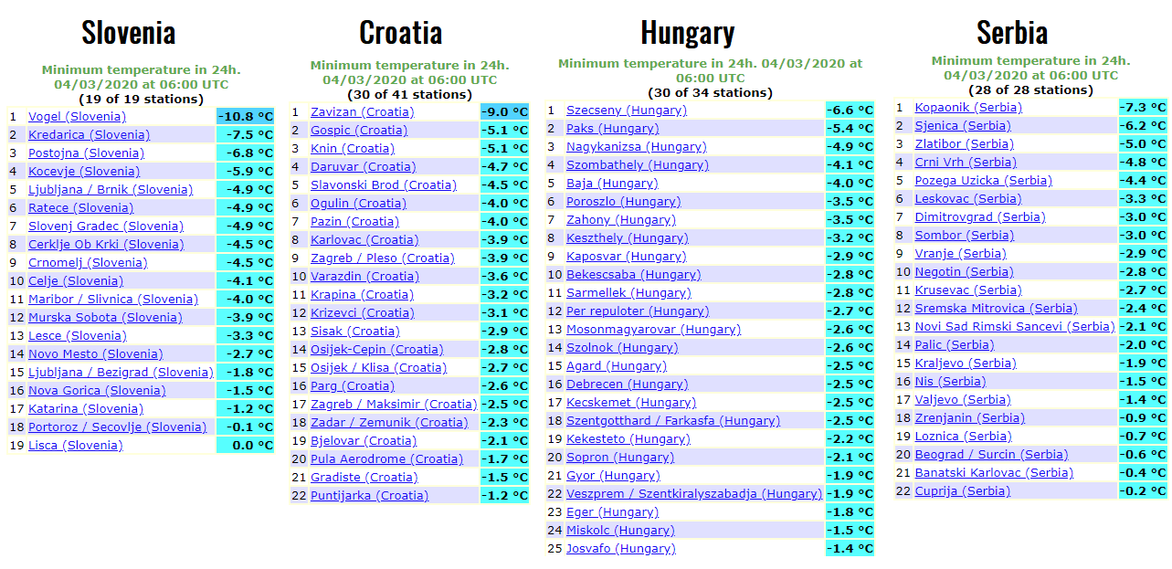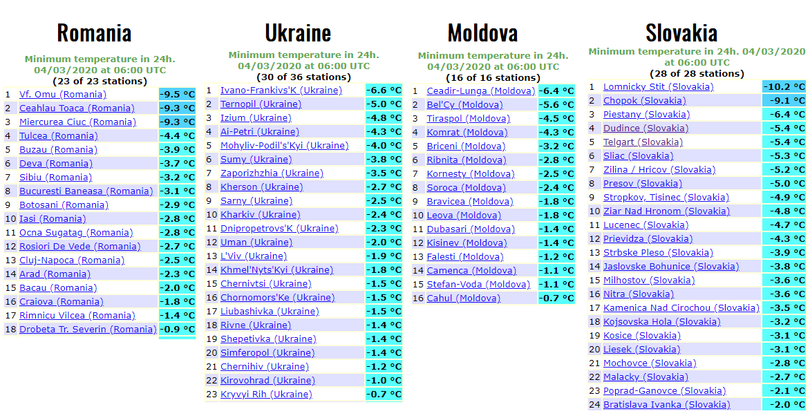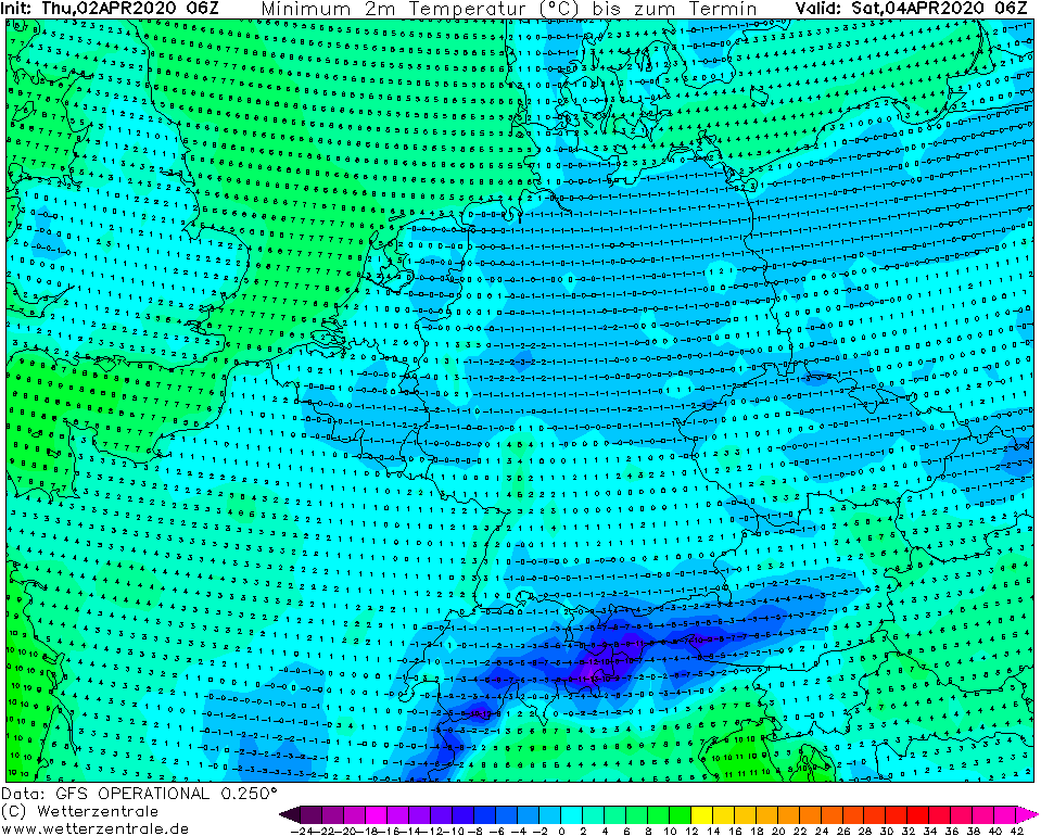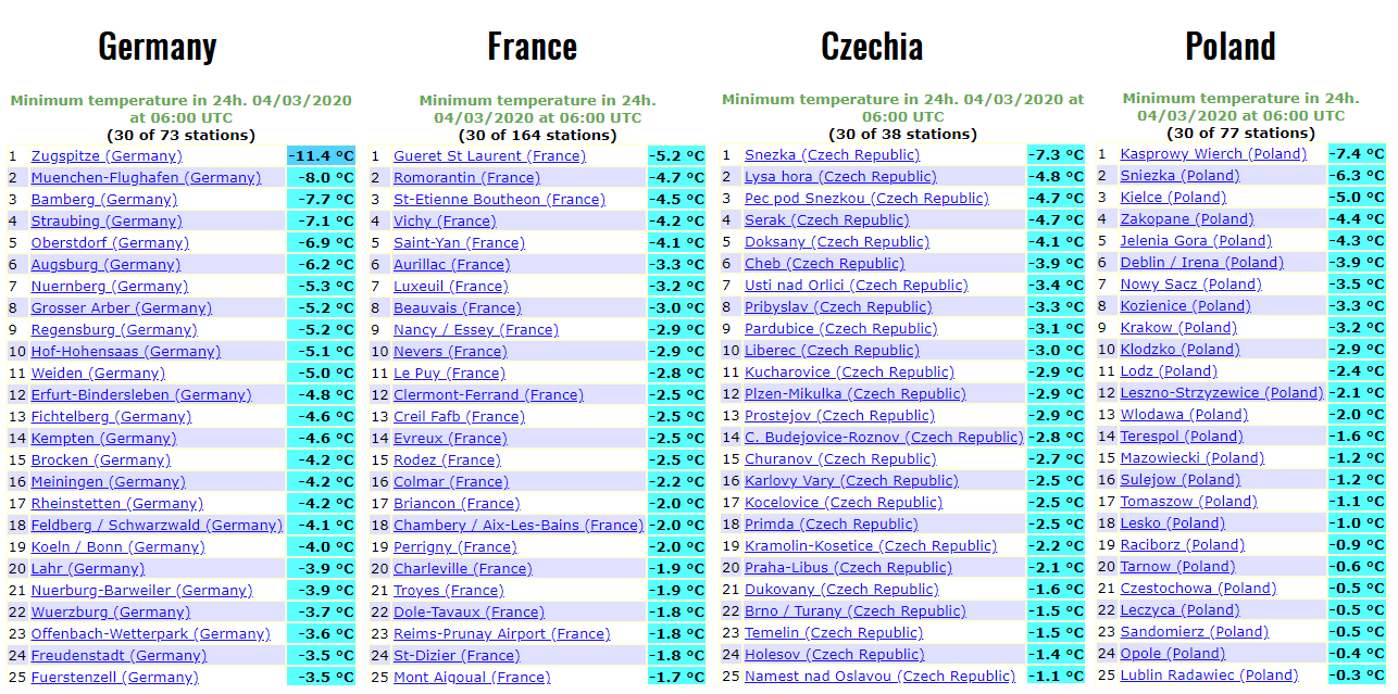 Yet another very cold morning in parts of central Europe and the Balkans today, Apr 3rd. Numerous stations were experiencing close or even below -5 °C, with strong frost observed as relative humidity was higher compared to the previous days. Saturday will again bring quite cold and frosty morning in some regions, but less intense than these days. The cold outbreak is then finished and will be replaced with much warmer temperatures after Sunday. Cold weather will, however, remain over the southeast Europe.