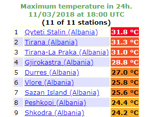 Temperatures in Albania reached up to 31.8 °C (Qyteti Stalin) and 31.3 °C (capital Tirana), the extreme south of Croatia pushed up to 28 °C. All these location experienced moderate Foehn warming, in addition to warm airmass being advected into the region from the central Other parts of the Balkans went up into the mid 20s. Another very warm day across the same region is expected today.