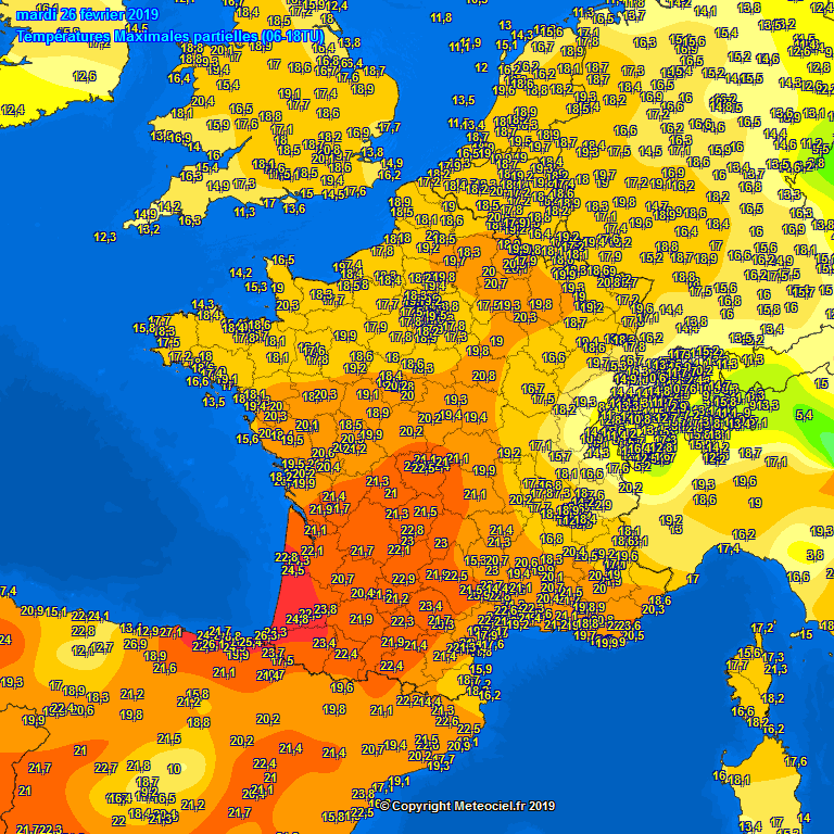 The large upper ridge that is dominating this week’s patterns across Europe is resulting in very warm weather, locally bringing record or near-record peak afternoon temperatures. The highest temperatures were recorded across parts of Portugal, Spain and south France, locally above 25 °C. 18-22 °C has been recorded in many other countries, while Denmark almost tied up the all-time record. Warm with 15-19 °C also in Sweden and Norway!