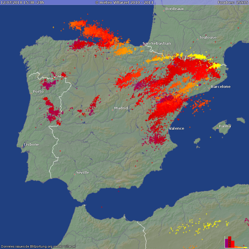 Numerous thunderstorms hit northeastern Spain yesterday afternooon, as evidenced by over 25 000 lightning flashes detected over the region. Video reports from Zaragoza indicate an intense wet downburst. Wind gusts likely well exceeded 100 km/h.