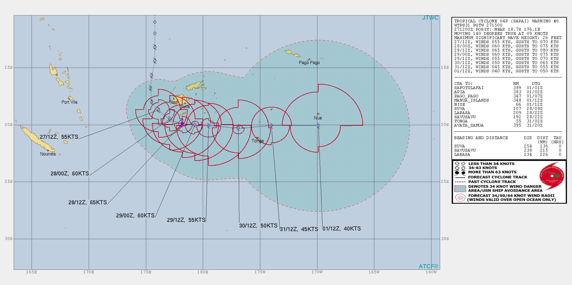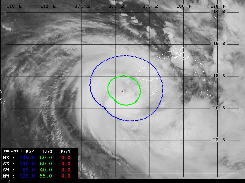 Advanced Dvorak Technique (ADT) analysis estimates the Raw T number around 3.5 and cloud tops below -70 °C lately. Sarai is for now maintaining its strong Storm strength with 50-knot wind radii expanding 55-65 miles around the center, reaching just offshore the main Fiji island Viti Levu.