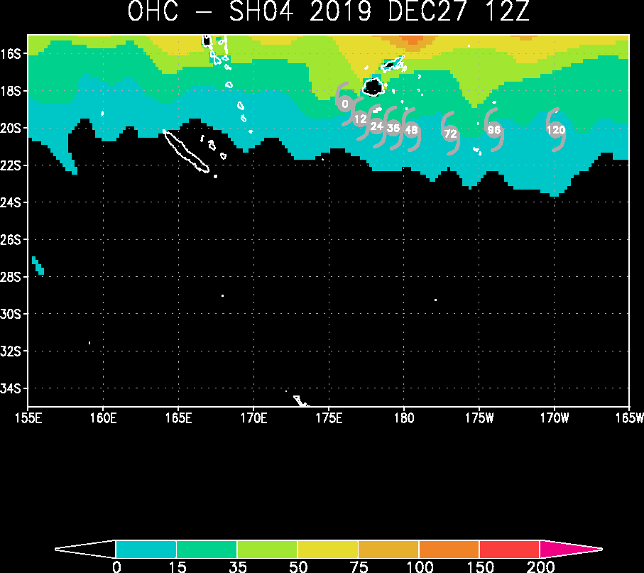 As mentioned above, Sarai is still moving south-southeast today but is expected to turn east after tomorrow, traveling with its center just south of the archipelago. The potential is increasing Sarai could be upgraded into a Category 3 cyclone with maximum sustained winds of 65-70 knots / 75-80 mph. Ocean Heat Content (OHC) map reveals there is some good ocean fuel for further maintaining deep convection of Sarai, as sea temperatures remain around 27-28 °C, although deep-layer shear will be in an increase in the coming days. This will affect the cyclone to begin weakening.
