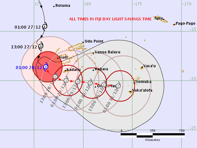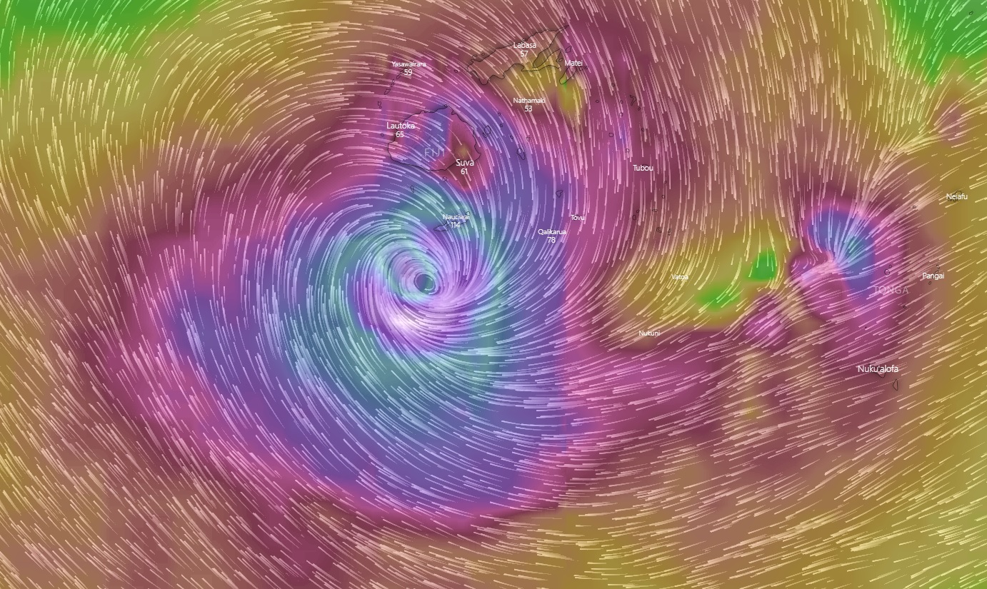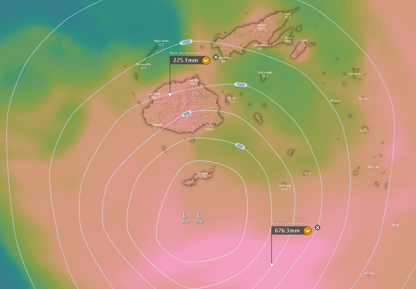 Fiji’s meteorological office has issued a heavy rainfall warning for flash floods, based on the expected high amounts of rainfall through the coming days. Local significant flooding and landslides are expected! Some areas on Viti Levu could receive more than 250 mm of rain, while the highest amounts of rain (close to 700 mm) is expected further south near the cyclone’s center.