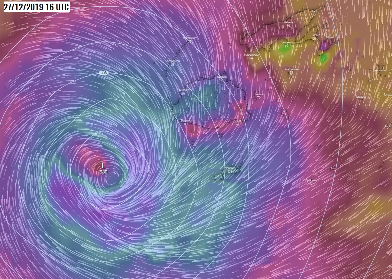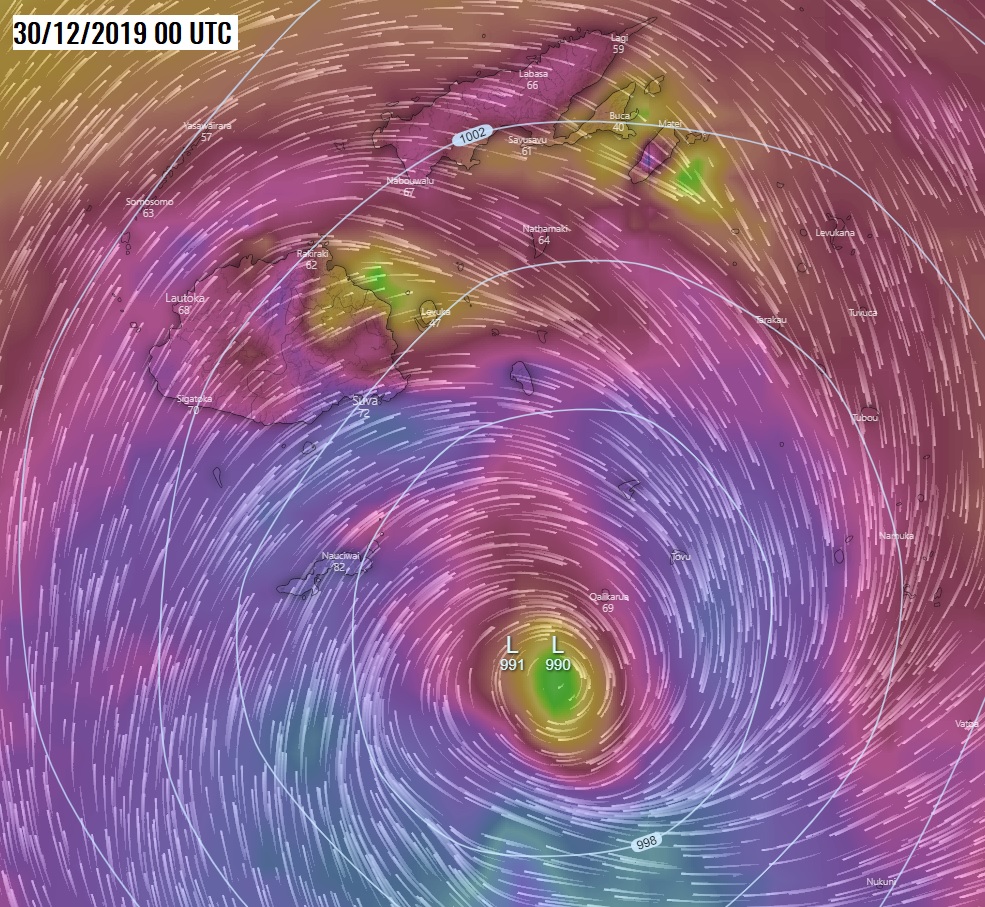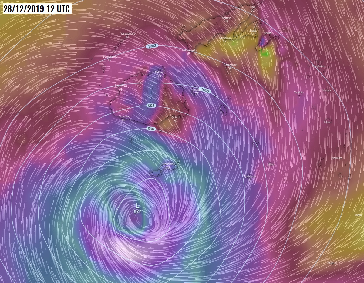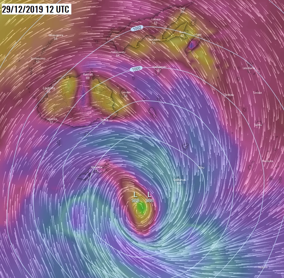 Here is the forecast map of maximum winds as of Saturday, Dec 28th, 12 UTC around Fiji archipelago. We can see very intense winds to the SW of the island Kadavu where the cyclone’s center will be located tomorrow. Severe winds will be expanded across most of the archipelago as well, could be violent gusts higher in the mountains of Viti Levu island.