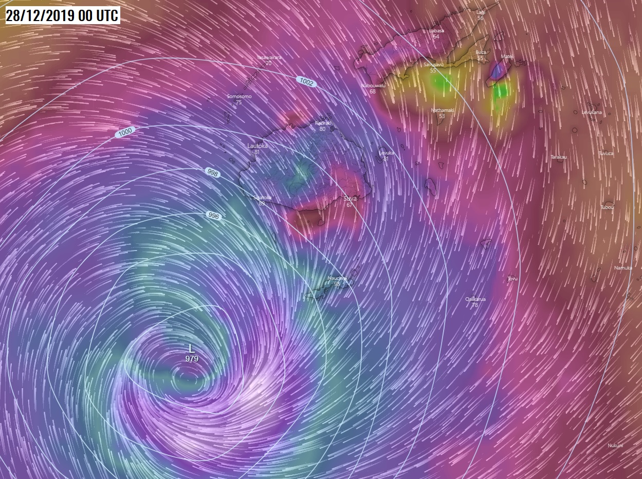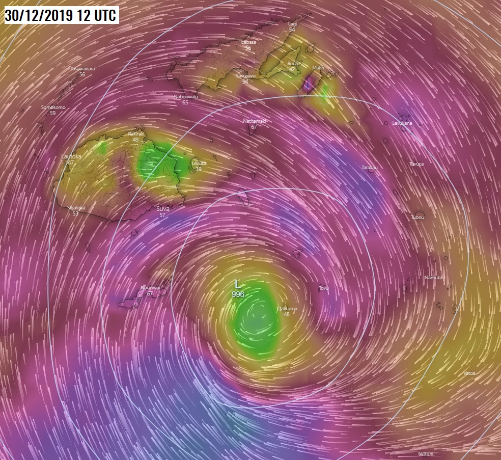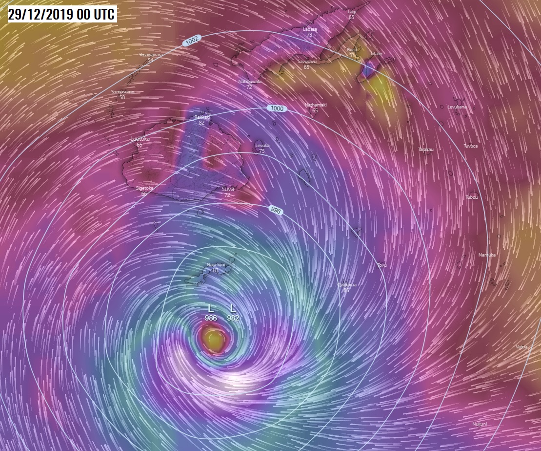 Here is the forecast map of maximum winds as of Saturday, Dec 28th, 12 UTC around Fiji archipelago. We can see very intense winds to the SW of the island Kadavu where the cyclone’s center will be located tomorrow. Severe winds will be expanded across most of the archipelago as well, could be violent gusts higher in the mountains of Viti Levu island.